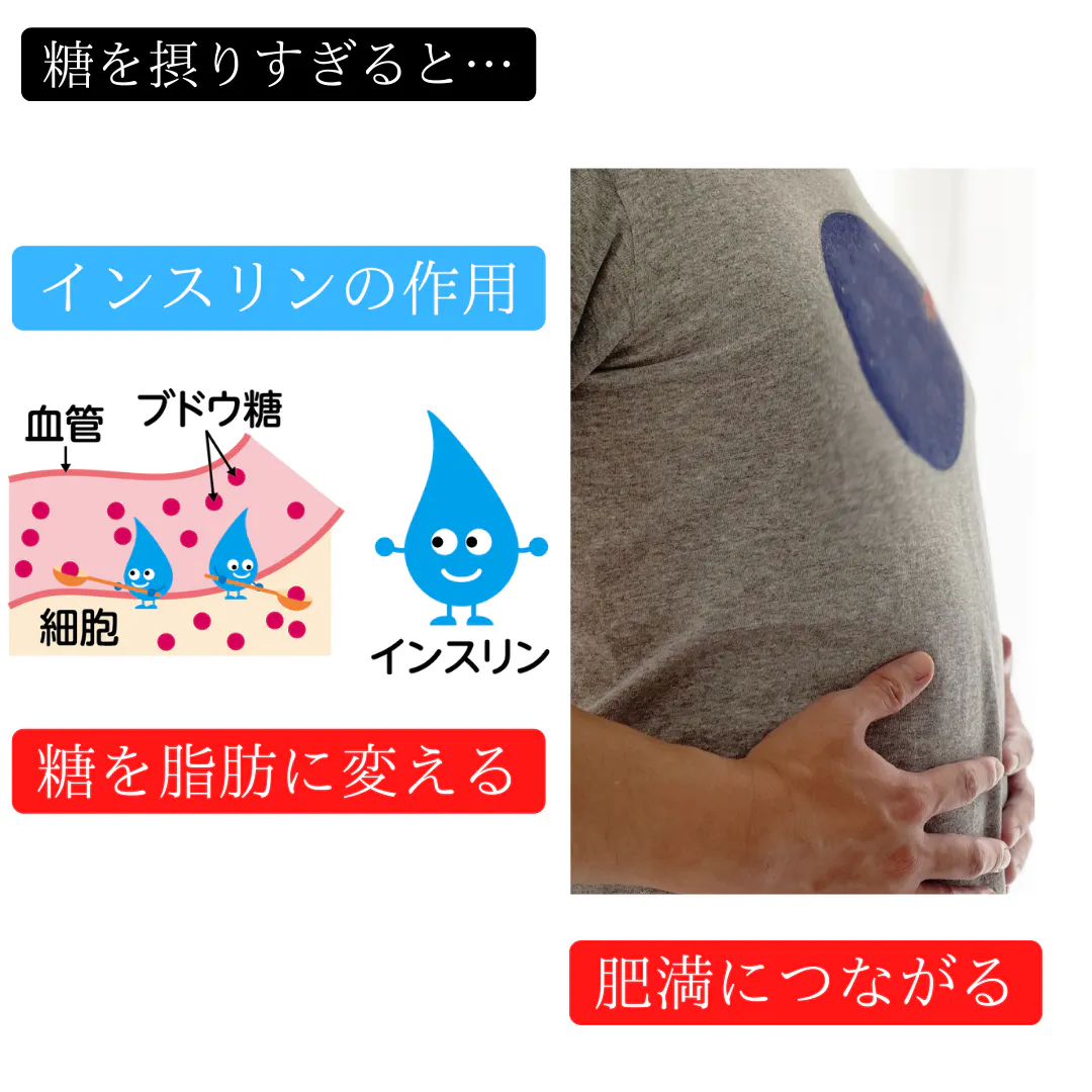インスリンには糖を脂肪に変えて蓄える作用があります。糖が脂肪に変換され肥満につながります。