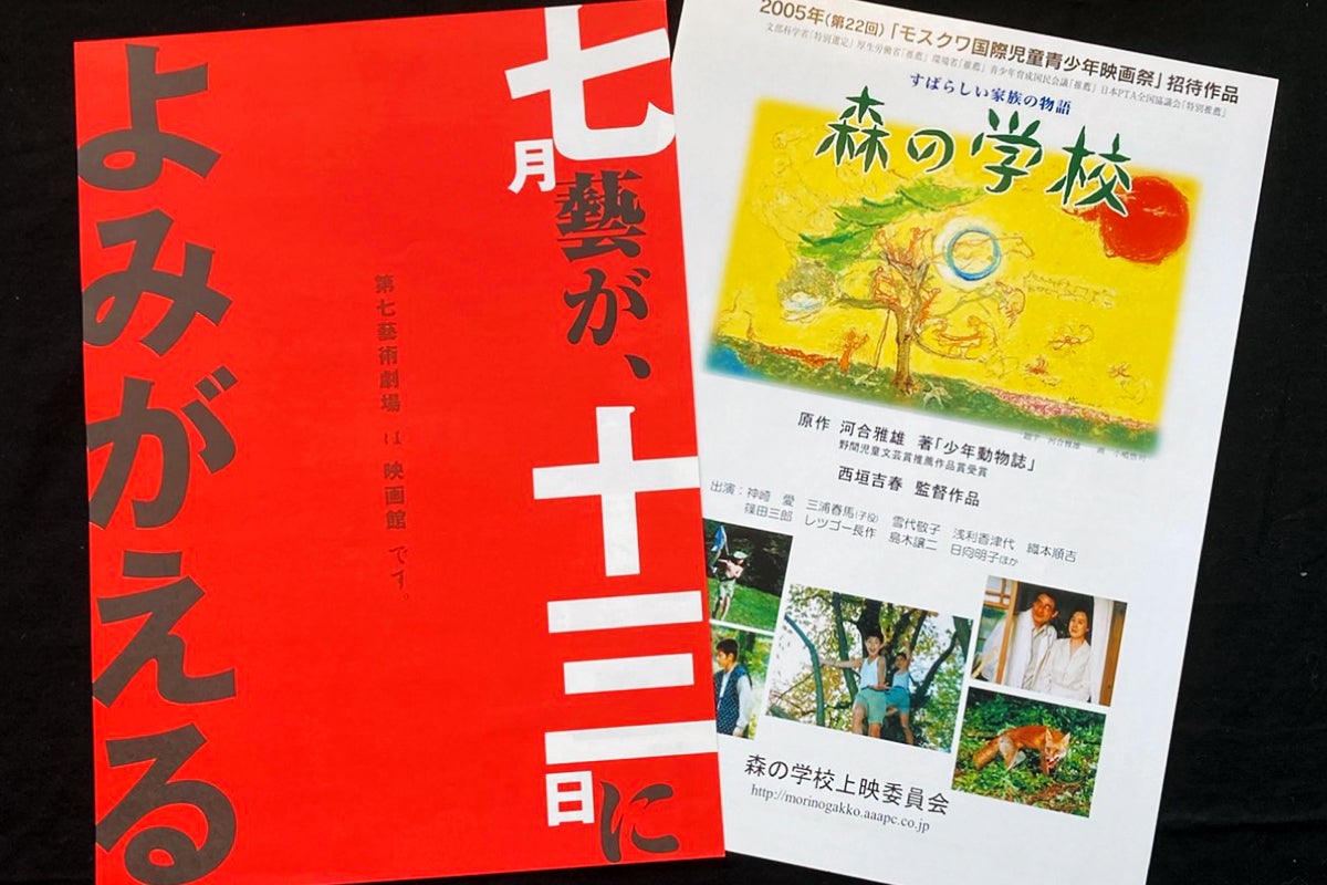 <2002年7月13日再オープン時のチラシと、オープニング作品となった『森の学校』のチラシ>
