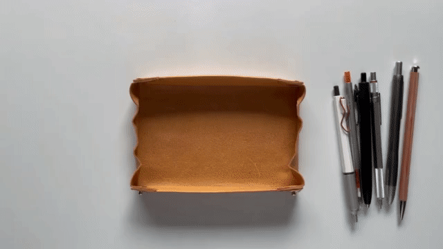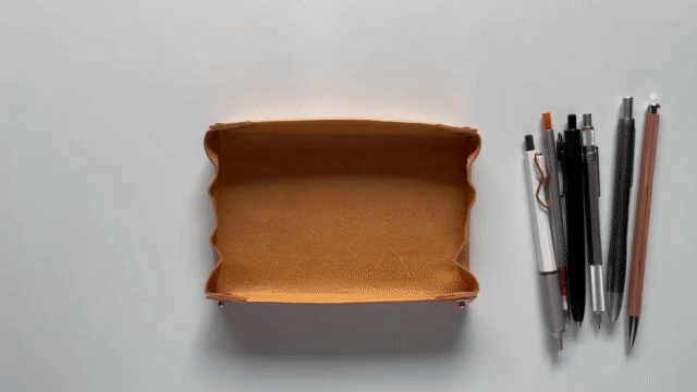折り紙のように革を畳んで立体にする事でペントレイの形のまま丸め込む事が可能になりました。