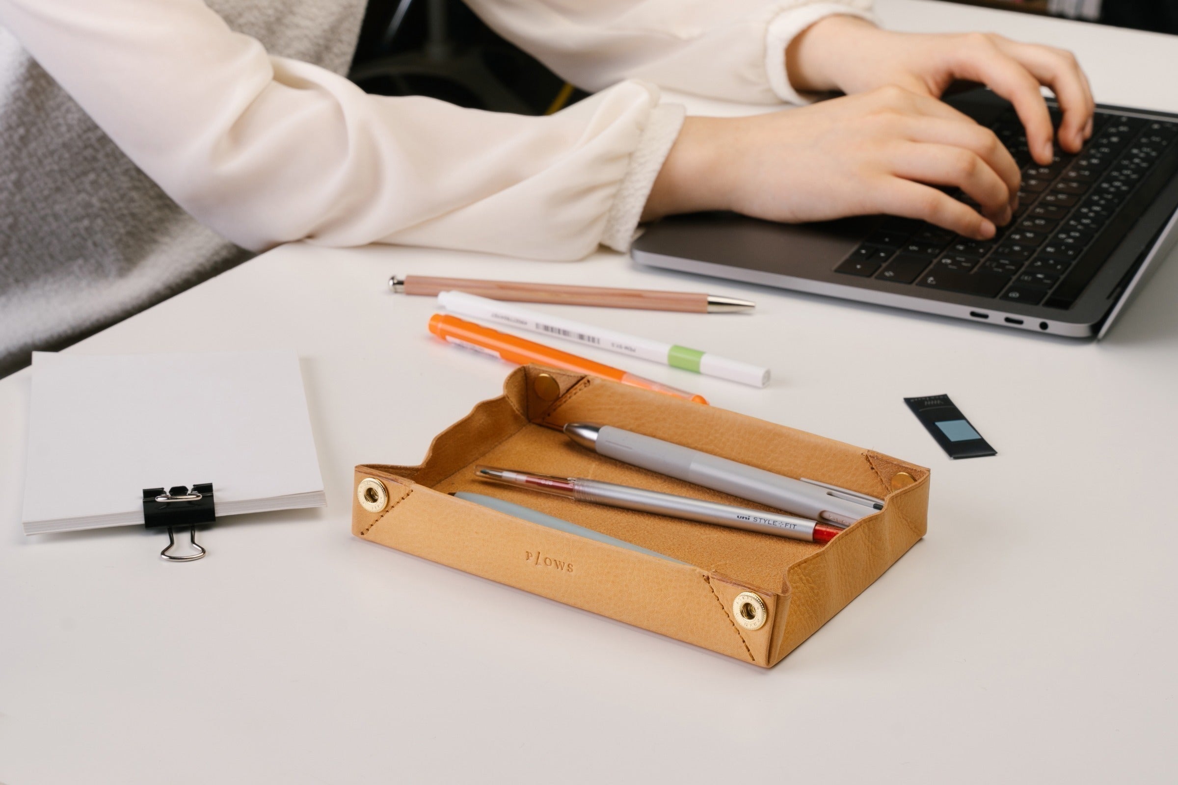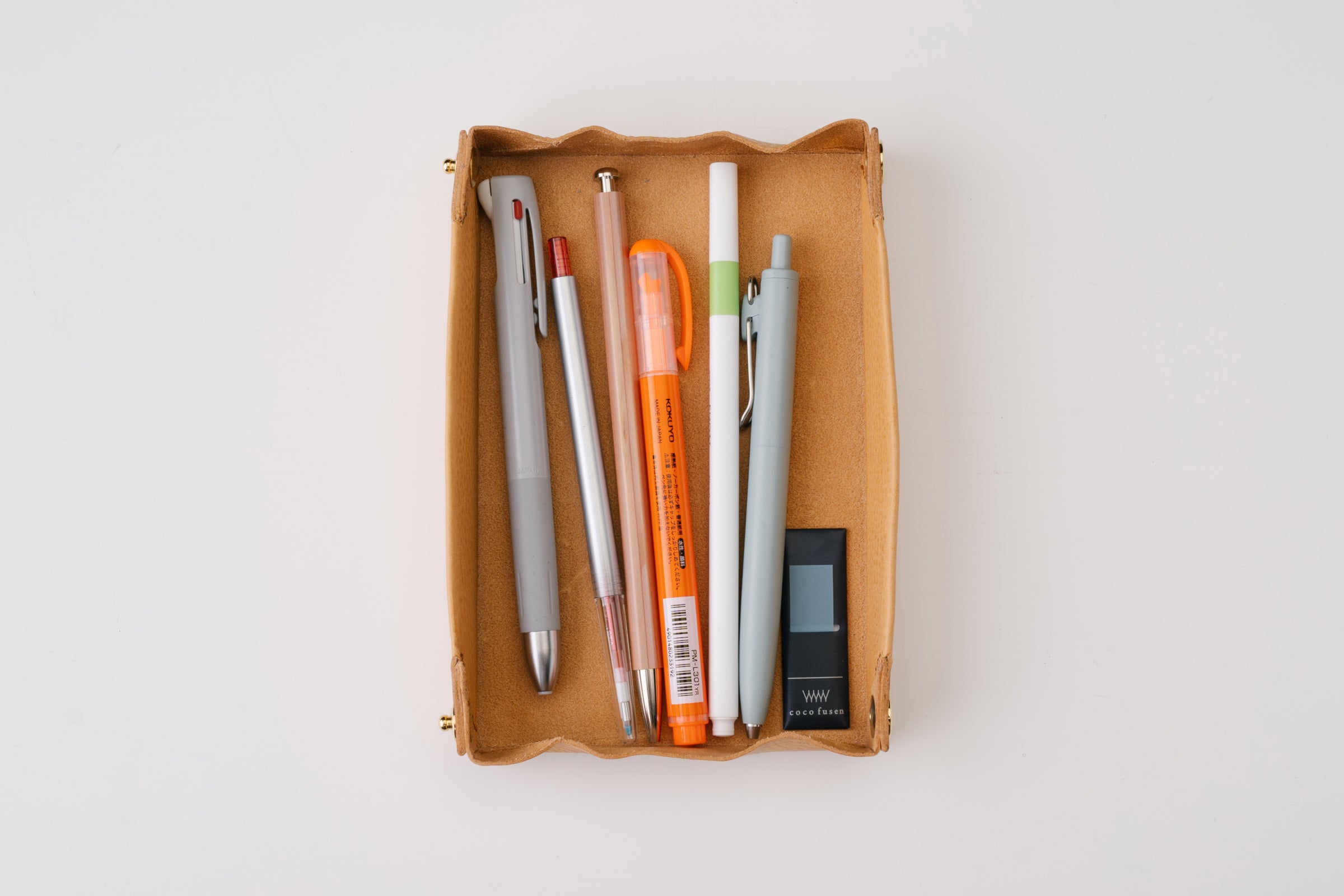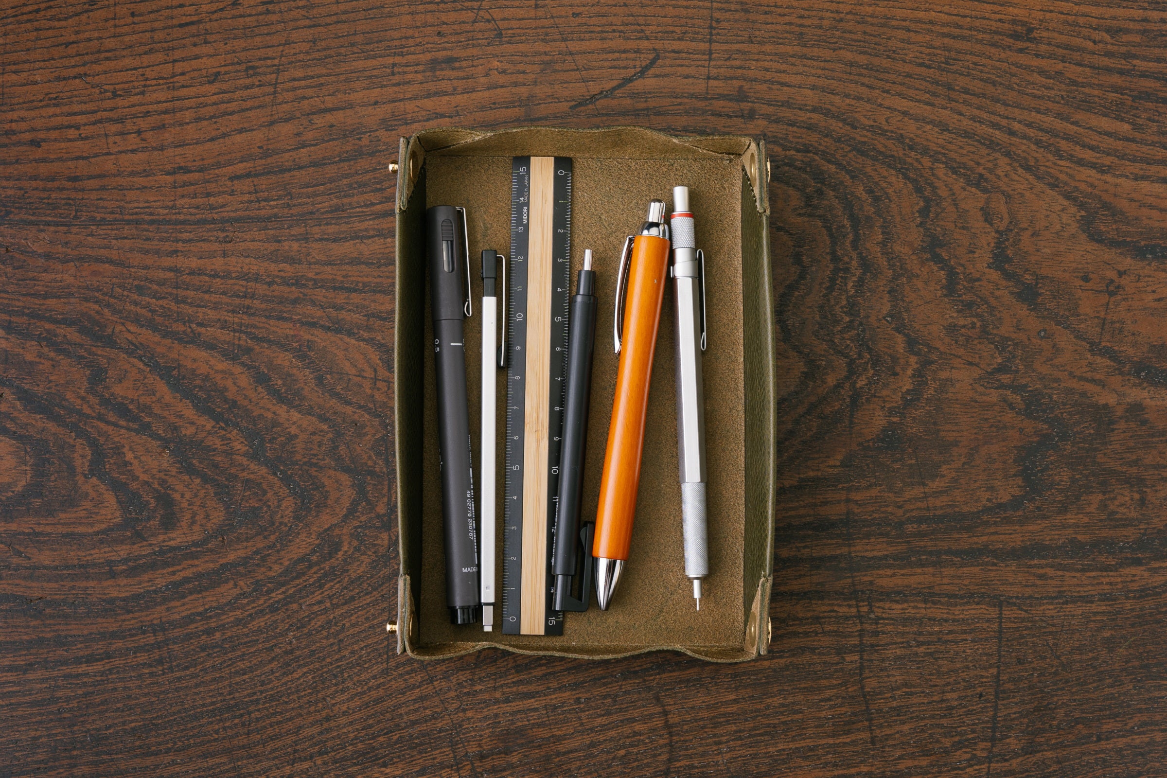 ペントレイで机の上が散らからない。いつものペンはいつものトレイで。