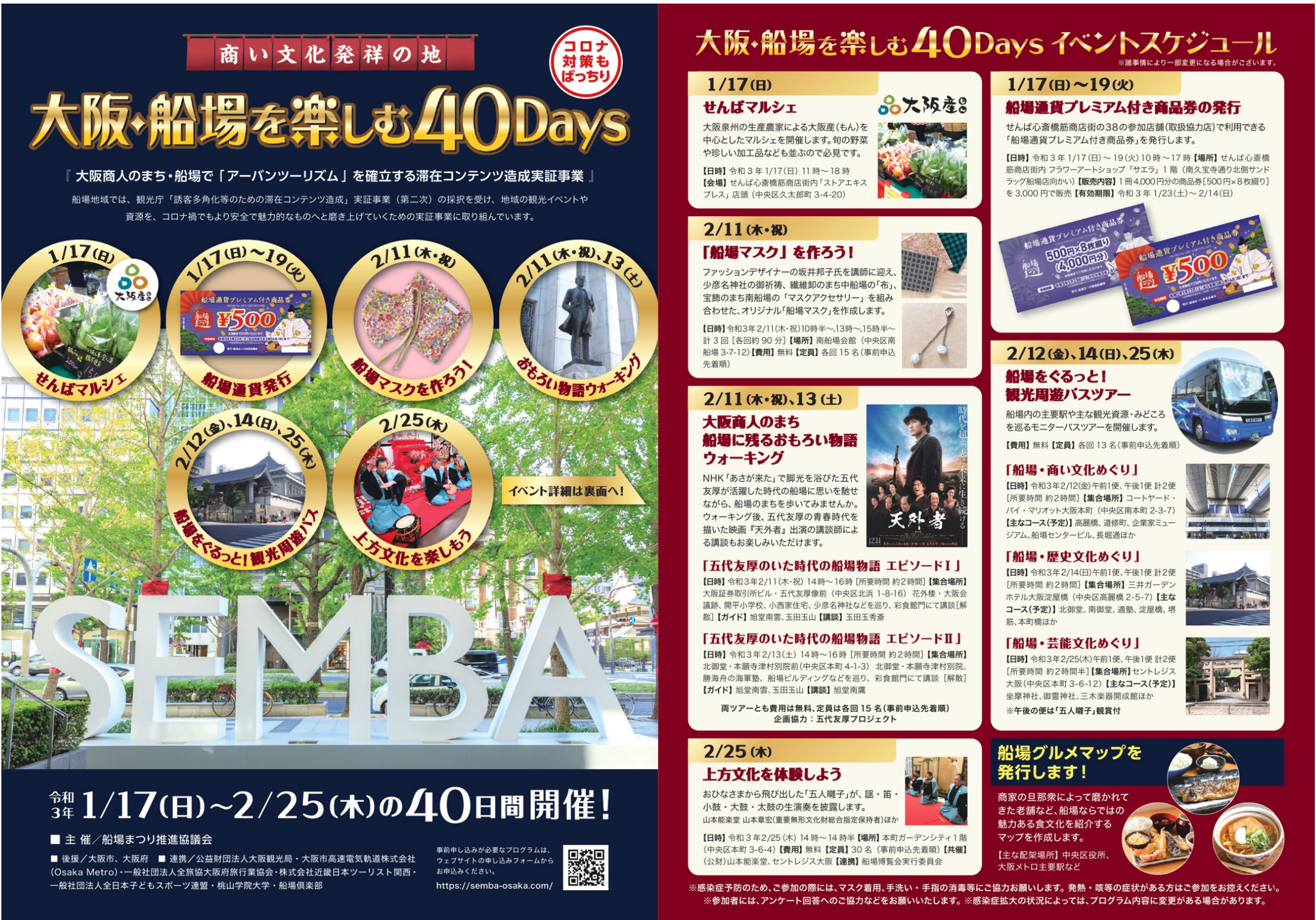 また、令和2年度観光庁「誘客多角化等のための魅力的な滞在コンテンツ造成」実証事業(第二次)に採択され、船場の中央に位置する商店街を中心に滞在コンテンツの造成にむけた実証事業を行いました。