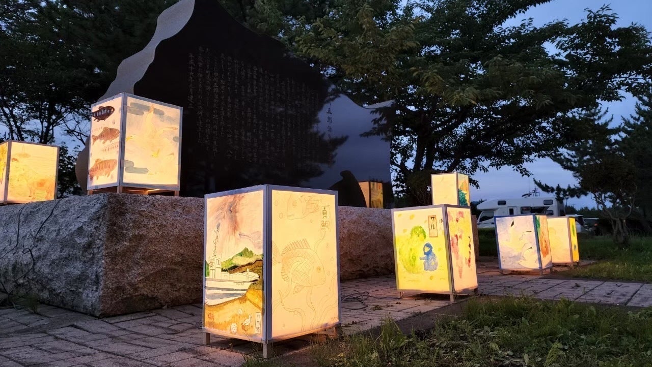 ライトアップされた五郎治の顕彰碑