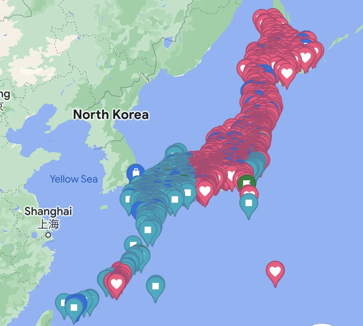 ピンク色のピンが訪れた場所、水色のピンがこれから訪れる場所です。