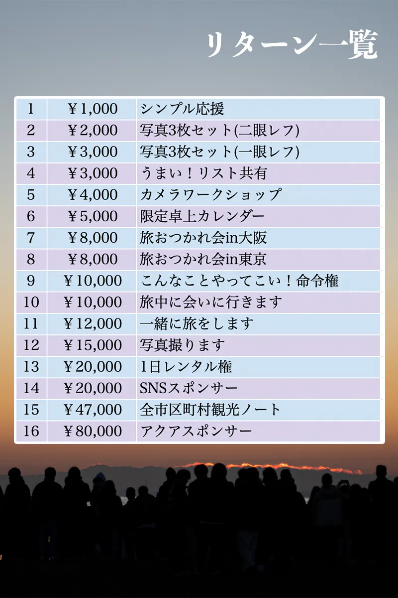 気に入ったリターンでご支援と、よければ、近くの人にシェアしていただけると嬉しいです。すっごく助かります。