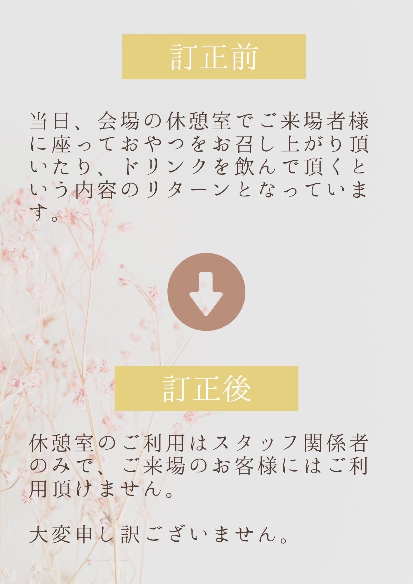 会場使用説明の際に、会場に隣接している飲食のできる部屋を『休憩室』と解釈してしまい、誰もが休憩できるスペースなんだと思い込んでしまいましたが、実際は『主催者控室』とのことで主催者及びスタッフの控室となっておりました。