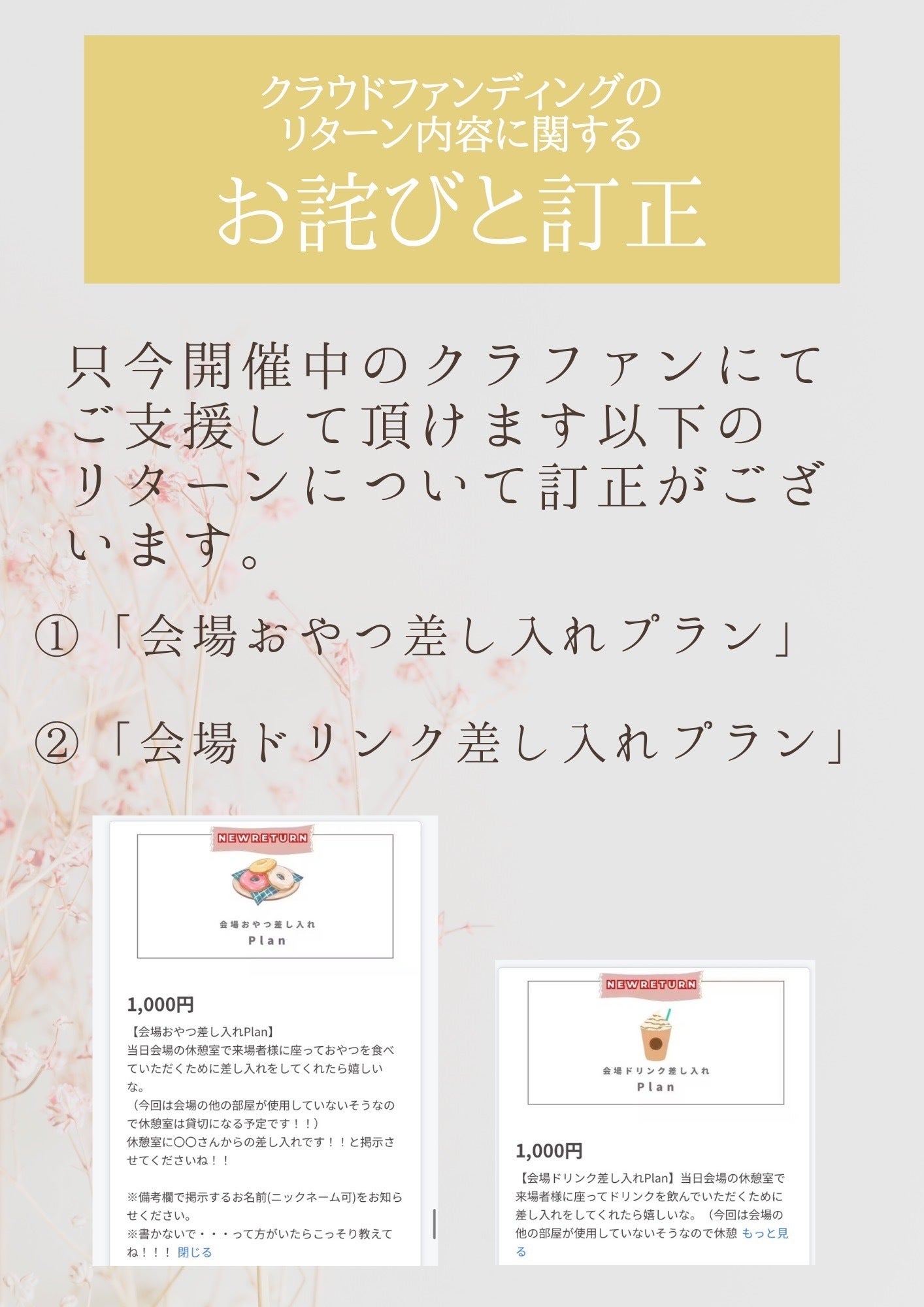 変更になるリターンは『会場おやつ差し入れプラン』と『会場ジュース差し入れプラン』の2点となります。