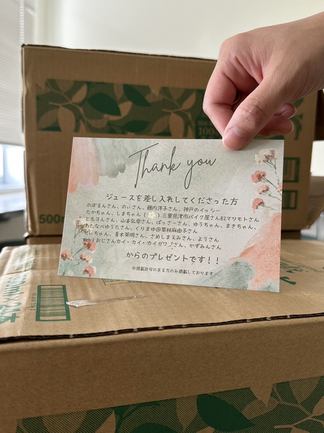お菓子とジュースのリターンを本日よりお渡しさせていただいております。