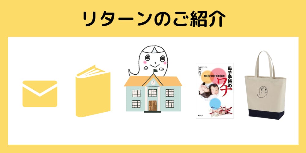 改めて、クラウドファンディングのリターンのご紹介をいたします。お子さまと読みたい方は絵本付のリターンがおすすめです。複数セットの絵本では、お子様のいるお友達や家族、出産祝いでのプレゼントもおすすめです。さらに、免疫力や自然治癒力への知識を深めたい方は、ぜひ高野弘之先生の講演会と著書「母子手帳のワナ」セットがおすすめです。子育て中の方にはぜひ一度は聞いていただきたい、読んでいただきたい内容です。荷物の多いママにも嬉しい大きめエコバッグ。子どもとのお出掛けや買い物エコバックとしても大活躍サイズ。生地は薄すぎず、厚すぎず、カバンに畳んで入れておくだけで急な場面にも対応できます。絵本を読む機会がない、プレゼントする予定もないけど賛同して支援いただける方は、絵本10冊をまるっと寄付できるリターンがおすすめです。子ども達が絵本を手に取る機会の多い、図書館や園や学校に絵本を献本いたします。現在、沖縄県内の施設へ配る予定ですが、需要がありましたら県外へのリターンも追加していきたいと思います。この絵本を通して、健康で笑顔になる子どもが増えるきっかけになっていただけたらと思います。皆さま、ぜひご支援をよろしくお願いいたします!
