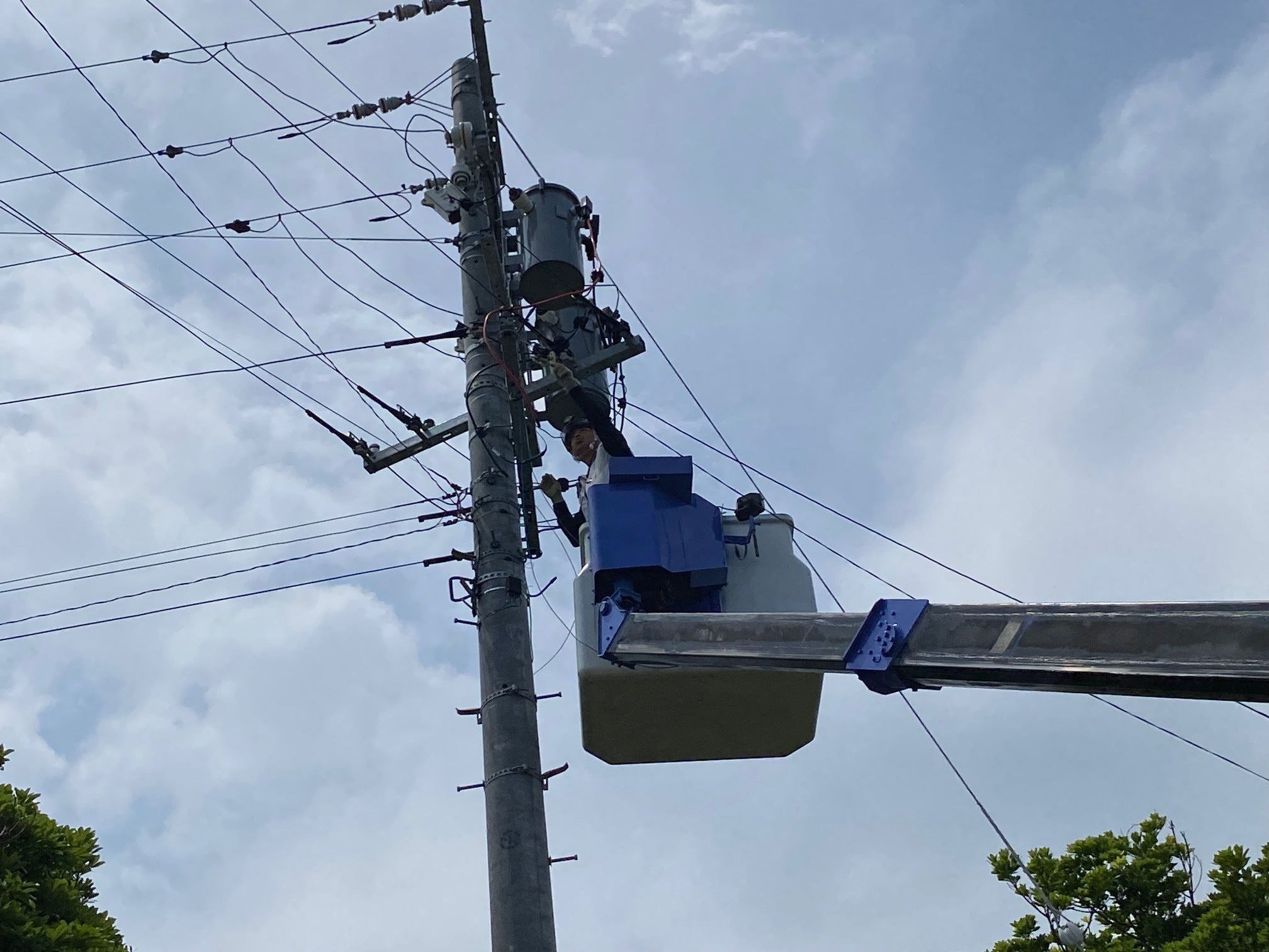 コメータ伊勢志摩の敷地北側に新しく移設された電柱。この電柱から本設用の電力引き込み工事を志摩電気さんにやってもらいました。