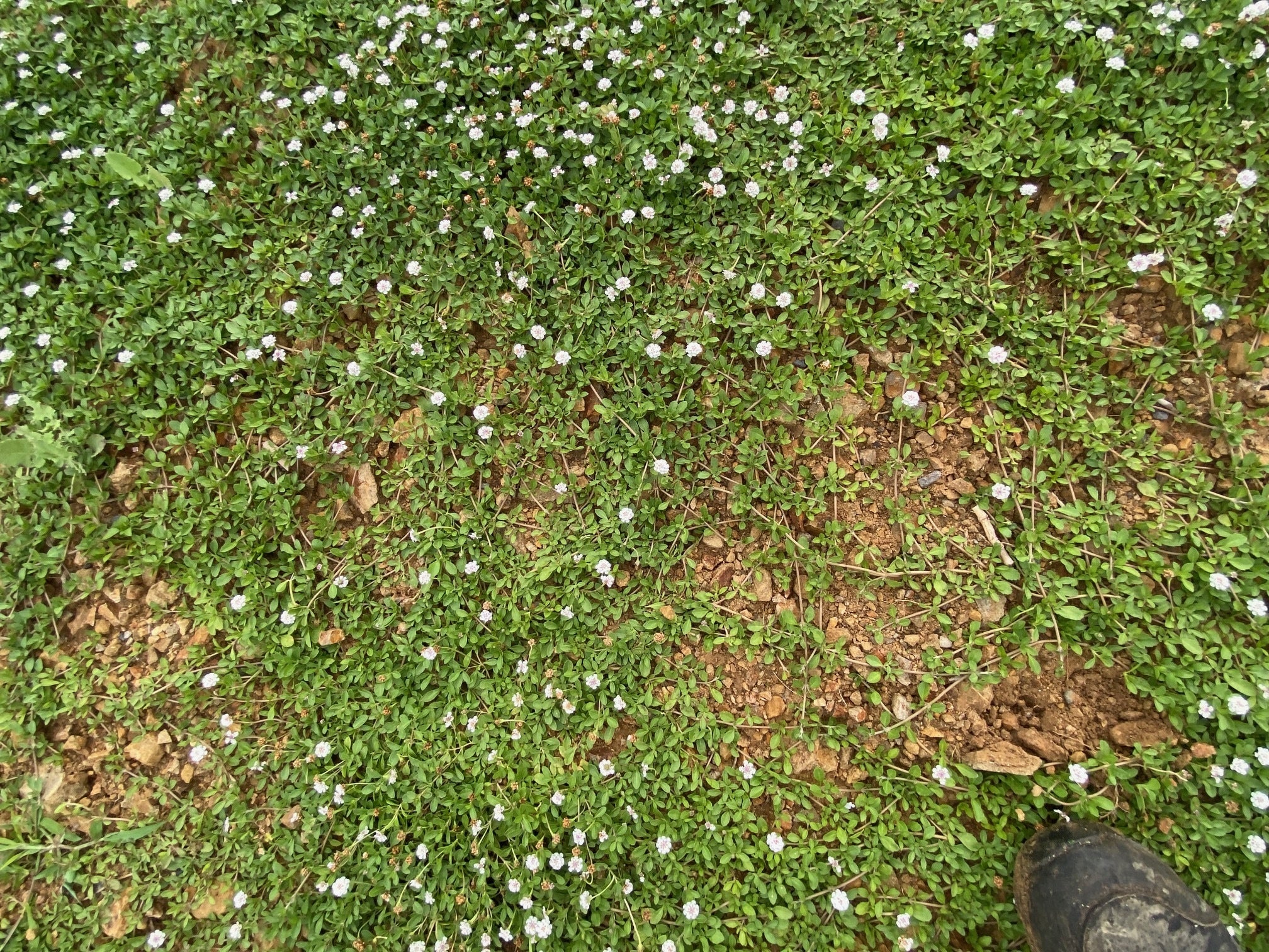 法面の保護のために植え付けたクラピアが大増殖して、小さな花を咲かせています。うちが植え付けたクラピアはK7という品種で、ちょっと花は少ない目の品種なんですが、白色に微妙に紫色が入った花が咲いています。