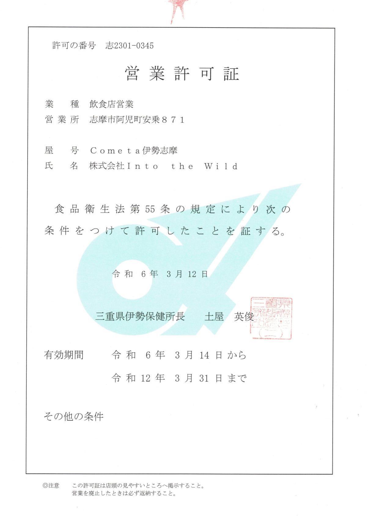 Cometa伊勢志摩の旅館業と飲食業の営業許可証が3月14日付けで発効されました。