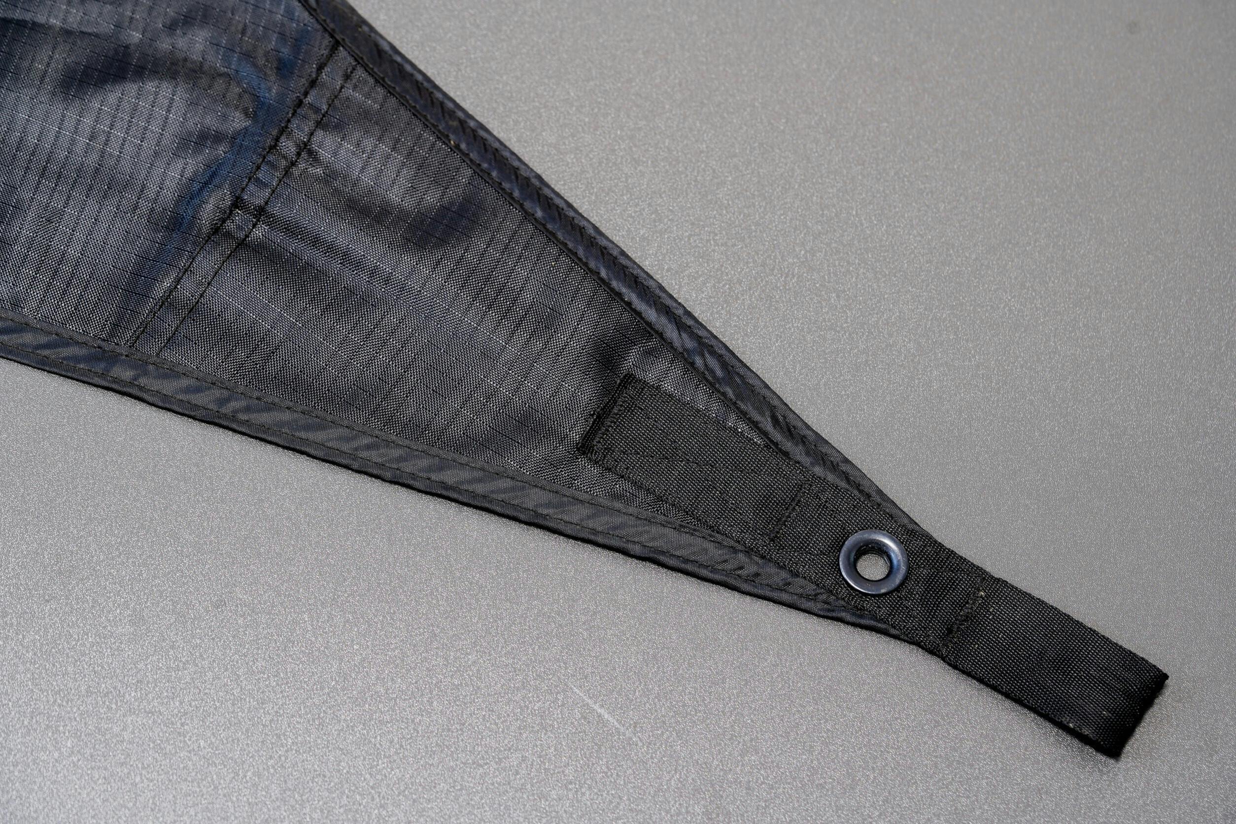 テンションを掛ける際に一番負担が掛かるのがグロメットとループです。グロメット部分を見ればタープの強度は大体わかります。何重にもしっかり縫い込めば強度は高まりますが、ゴワゴワして見た目は悪くなります。タープ全体にテンションが均等に加わるように縫製することでシンプルな構造で抜群の強度を誇ります。ループには引張強度の高いナイロンを使用し、グロメットはカラビナやロープ、ポールの先端を差し込みやすいサイズです。