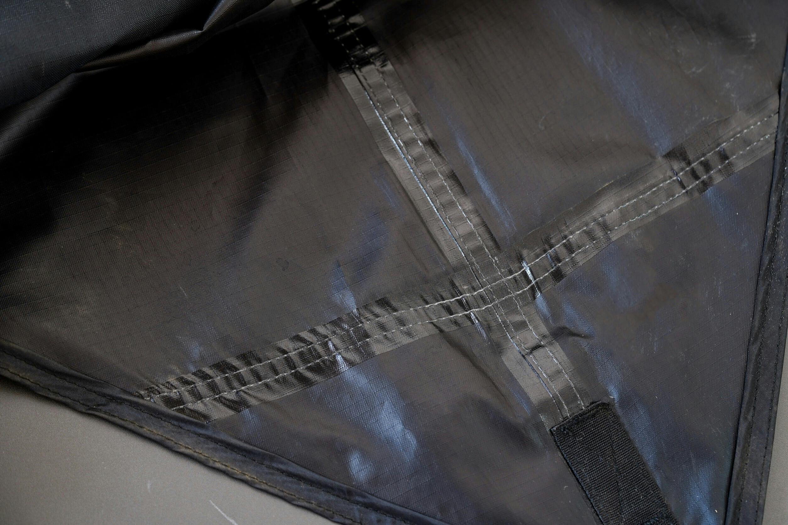 シームテープ処理(生地の継ぎ目、縫い目を止水テープで処理すること)はコーティングと生地の相性が重要です。相性がいいと判断されたシームテープの中から実際に使用し選定しシームテープを使用しております。写真は雨、風、高温低温の中、ハードに使用したものですが、シームテープにダメージはありませんでした。シーム処理があまく、性能が発揮されないと判断されたものは全て工場検品の段階で弾いております。