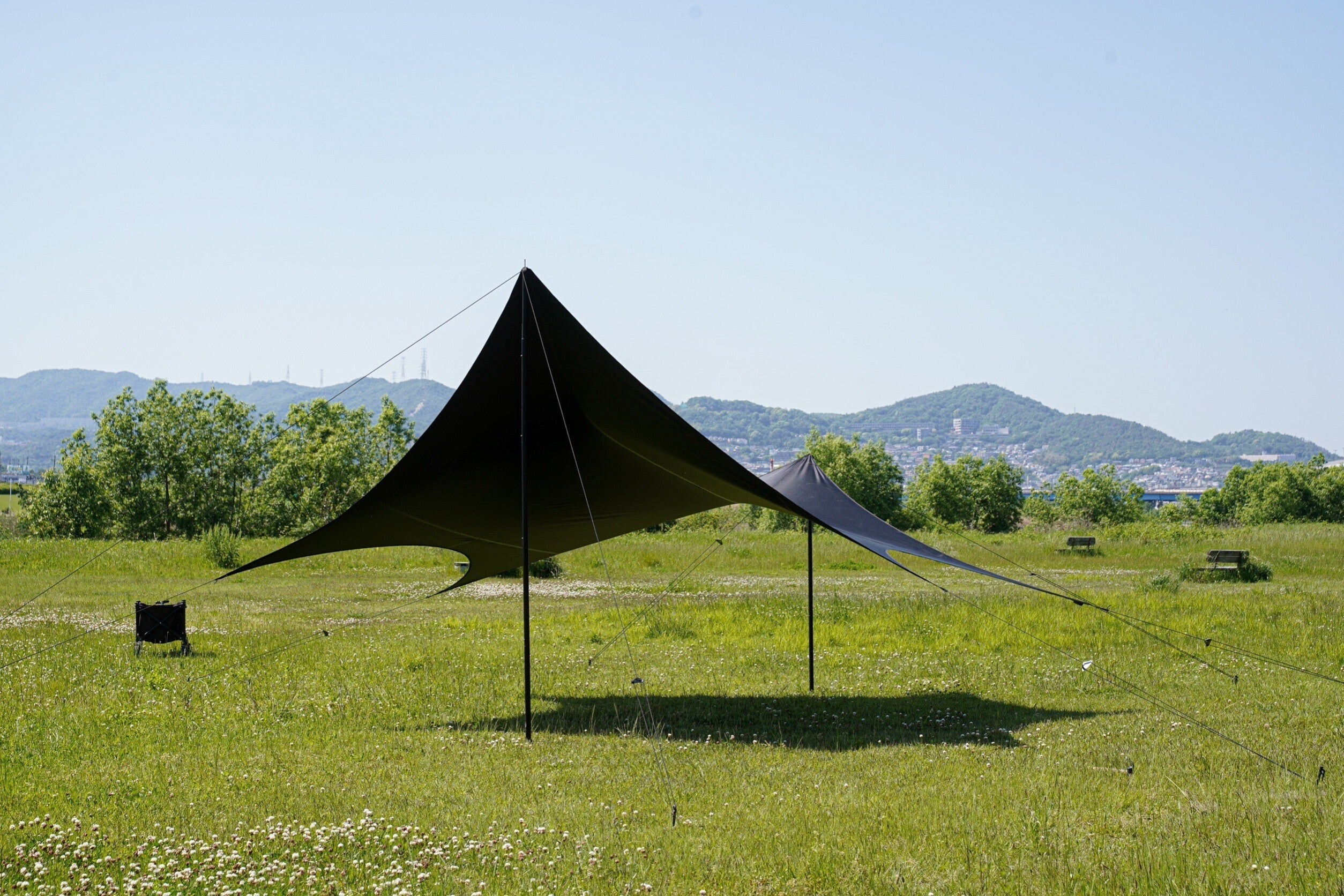 フィールドで目立つこと間違い無しのスタイル。閉鎖的な空間を作り出すことができる男前な張り方です。ポールの高さが前280㎝、後ろ120㎝で設営。タープというよりシェルターのような形状になります。