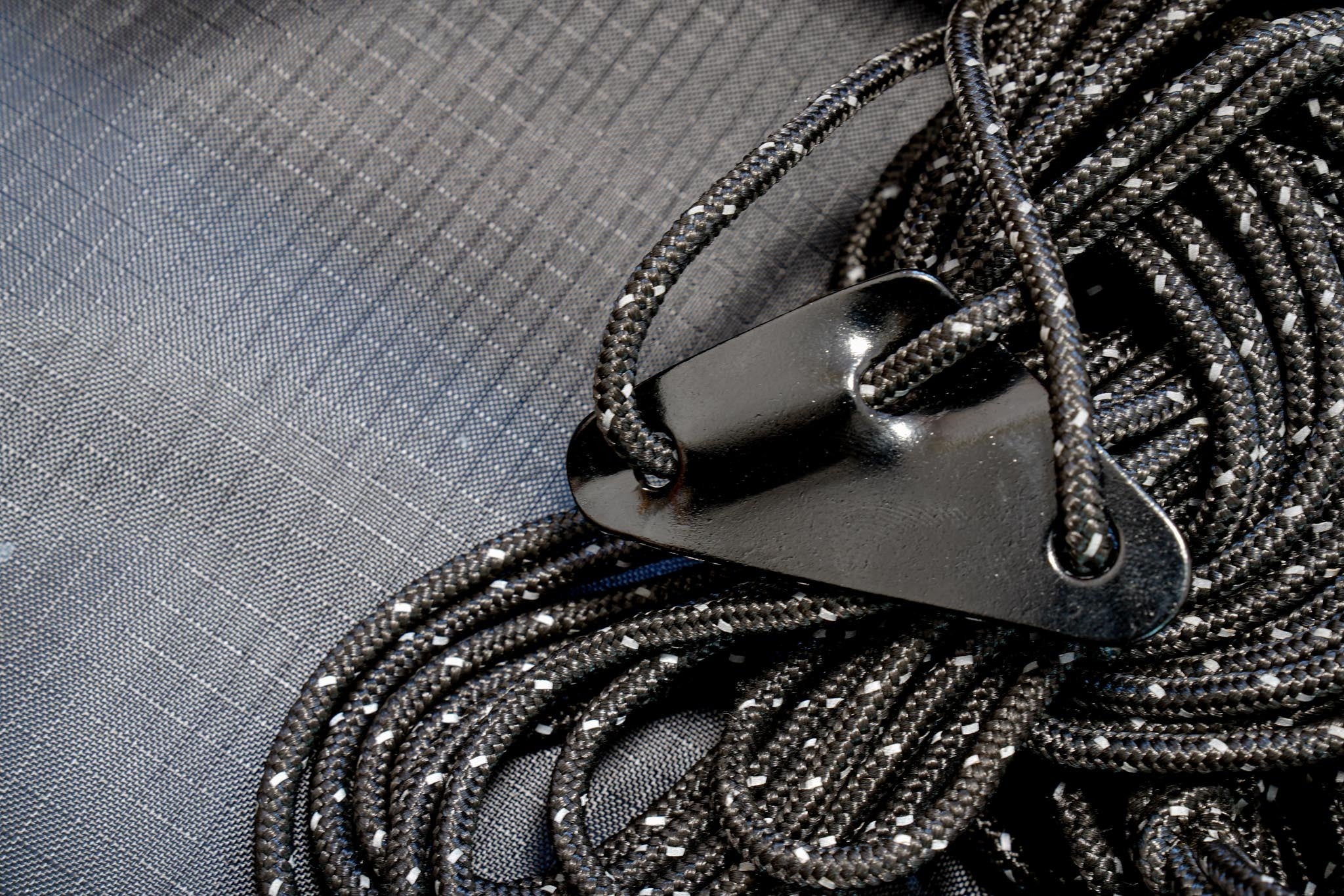 ポリエステルとナイロンの配合に拘り、硬く高負荷に耐えることができるガイロープをオリジナルで作製しております。反射材を編み込むことにより、ブラックのガイロープでも夜間の視認性を確保しました。