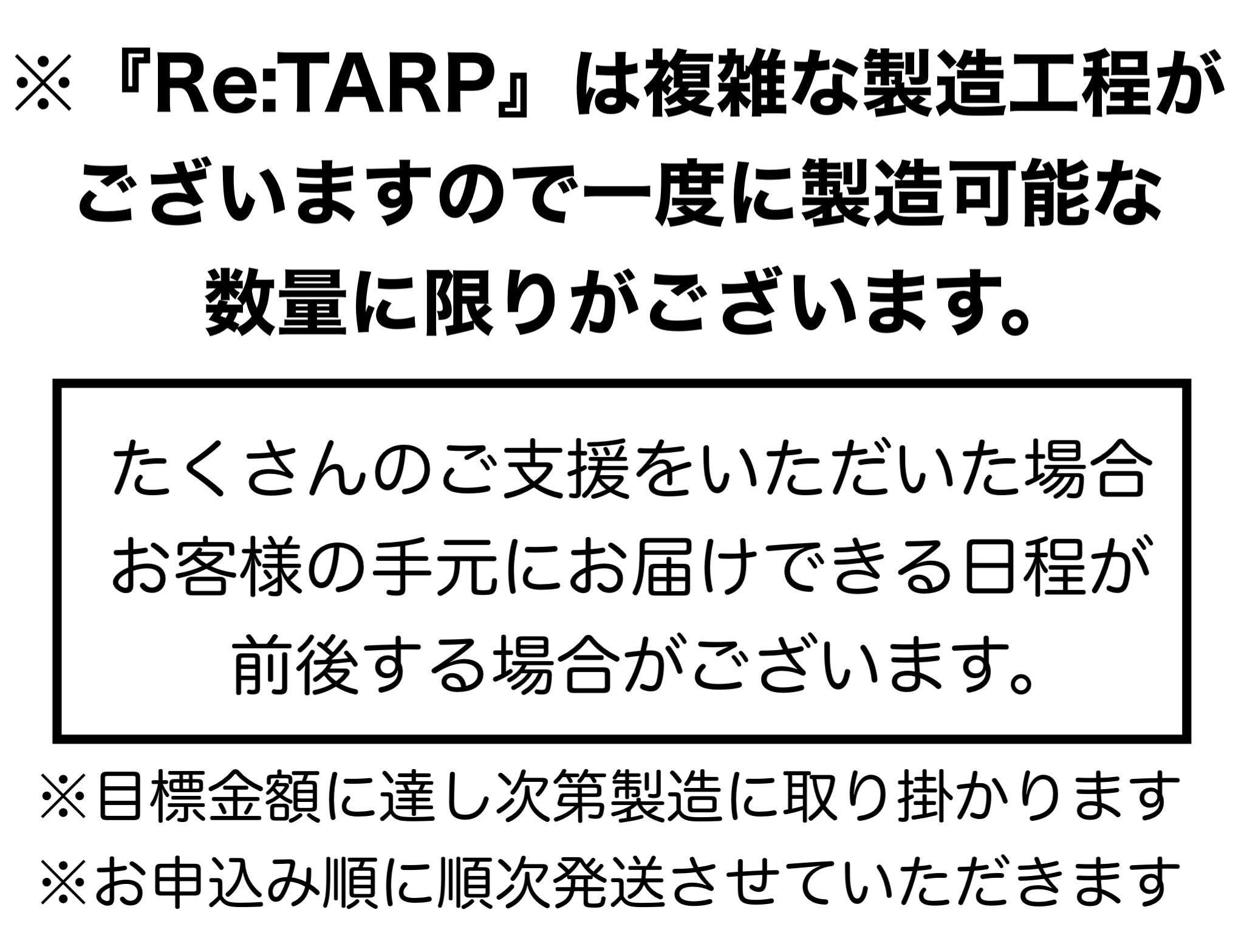 Re:TARPは、私が初めて企画開発した製品となります。ですので、今回[All-or-Nothing方式 ]にて挑戦させていただきます。目標金額に達しなかった場合はRe:TARPが製造されることはありません。クラウドファンディングでユーザーの皆様の声を聞かせてください。