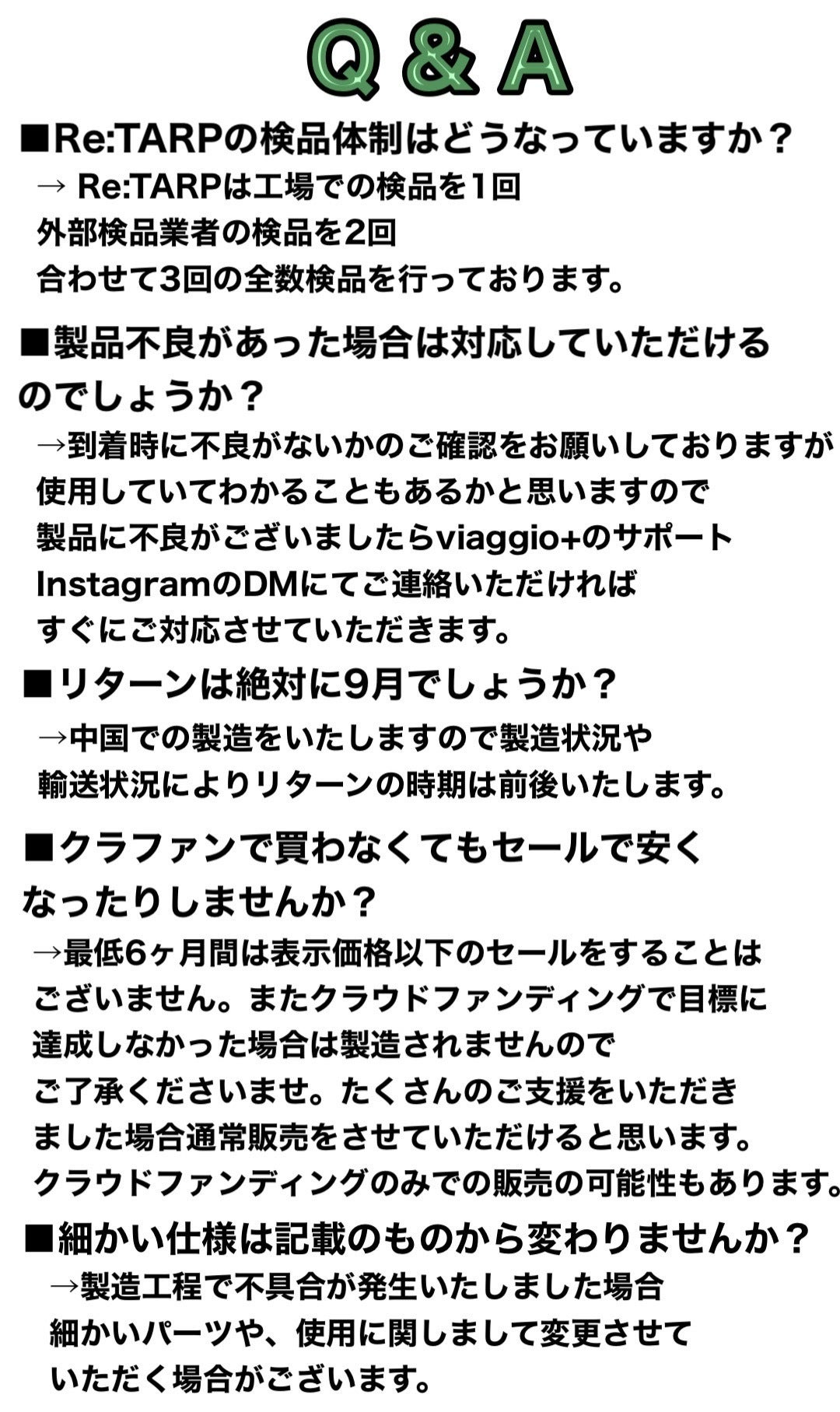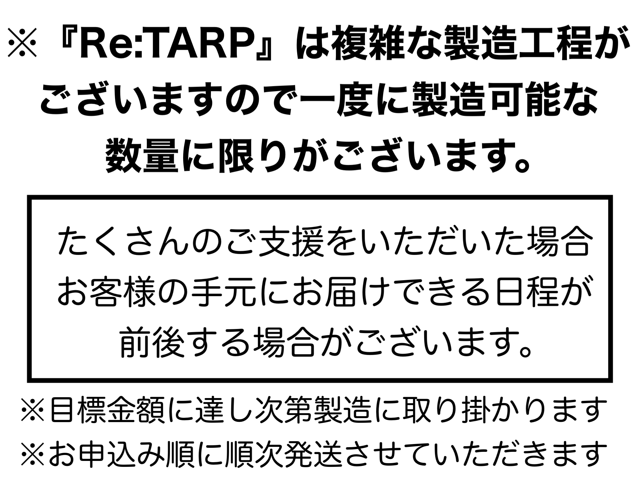 私たちは「 Re:TARP 」の 完成に向けて、誠心誠意進めています。 しかしながら開発中の工程において、より良い物作りの為、デザインや仕様が一部変更になる可能性もございます。製造スケジュールについては、現在プロジェクト成功を想定した数で調整しておりますが、想定を上回る支援の申し込みがあった場合、製造工程上の都合や配送作業に伴う止むを得ない事情によりお届けが遅れる場合が御座います。上記のようにプロジェクトページに記載している内容に変更がある場合は、できるだけ早く活動報告などで共有をおこなっていく予定です。最後に、ブラックヘキサタープ『Re:TARP』を手に取っていただいた皆様に喜んでもらえるよう、チームメンバー一同心を込めて対応していきますので、応援よろしくお願い致します。
