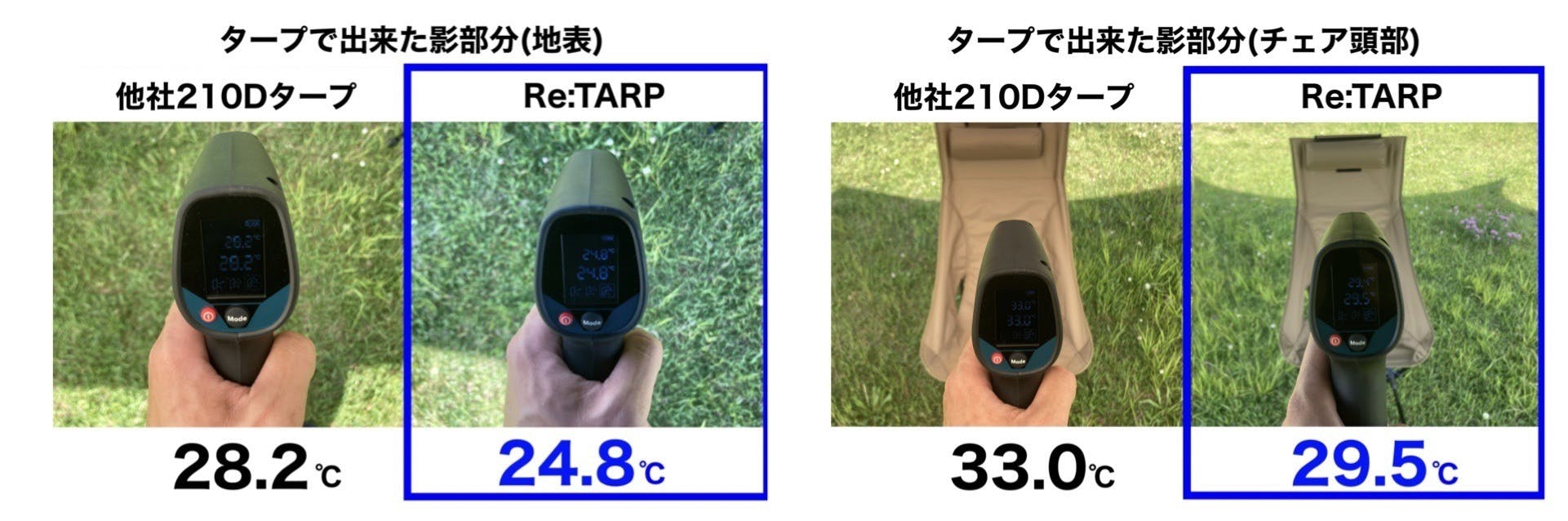 地表温度もチェアの頭部付近で計測した値もRe:TARPが3℃以上低い結果となりました。生地の構造とブラックコーティングにより、涼しい空間を作ることができました。