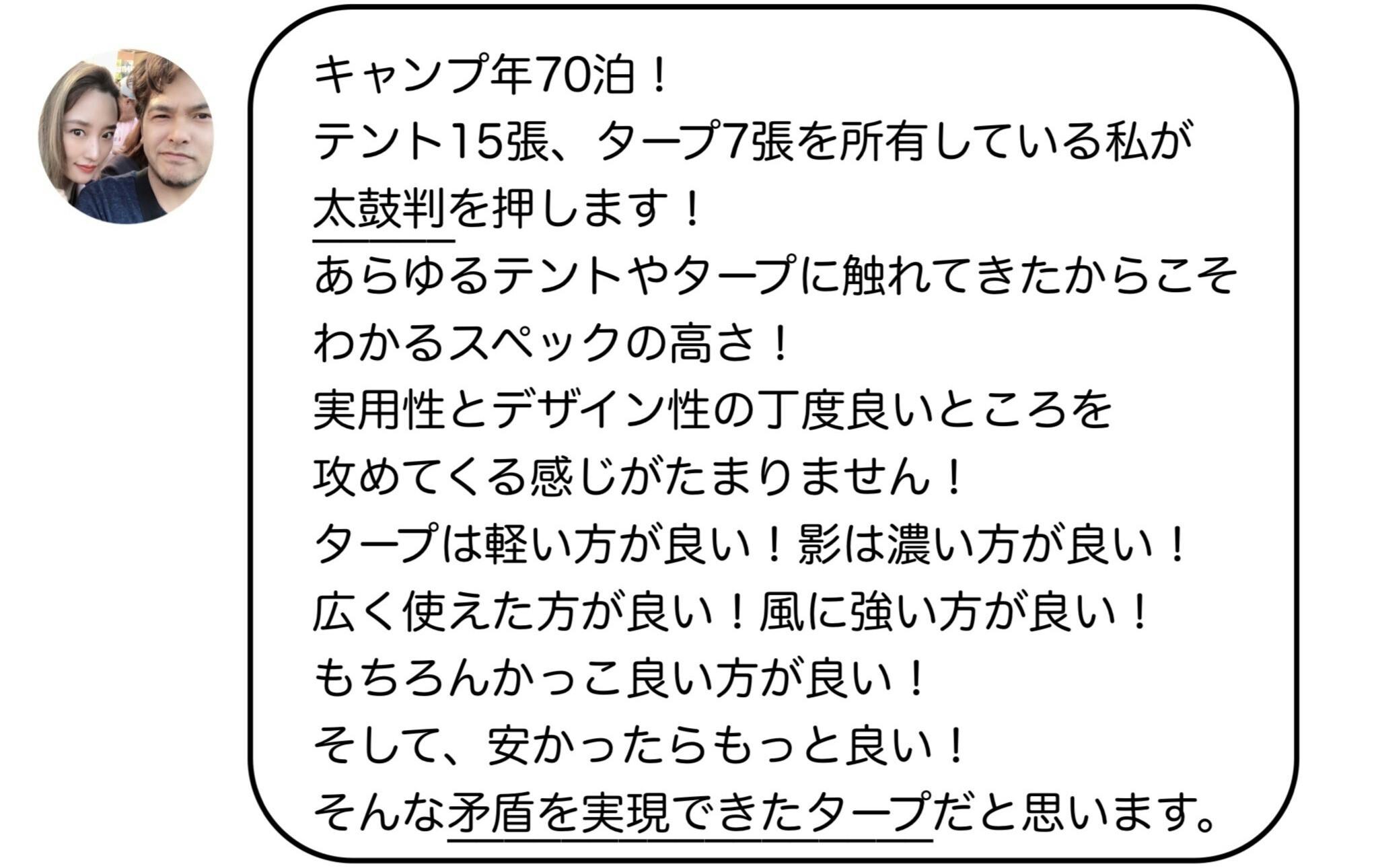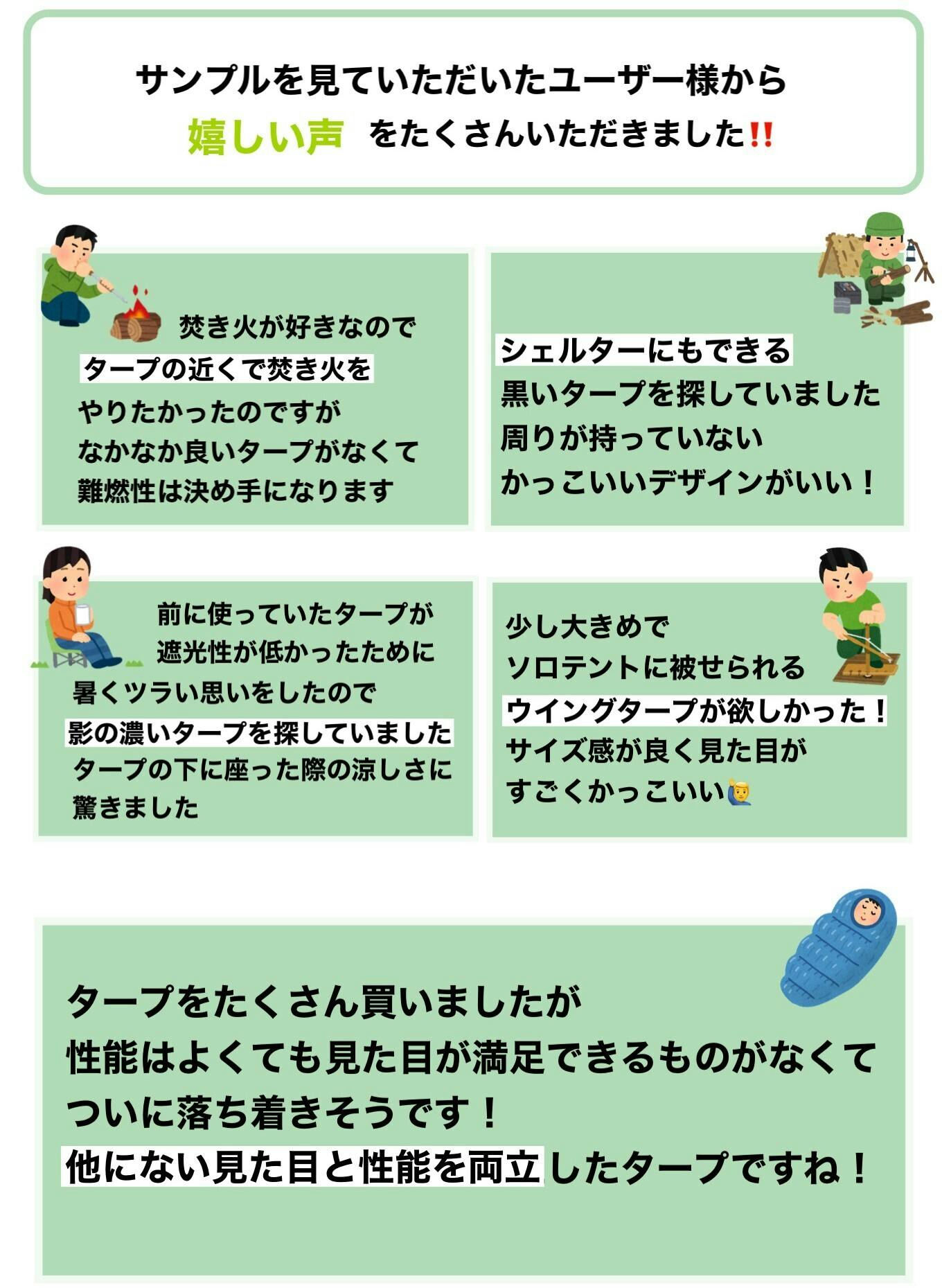 コメントの中に「あらゆるテントやタープに触れてきたからこそわかるスペックの高さ」と一文がありますが、まさにそうなんです。糸から拘っておりますので、見ればわかる。触ればわかる。こんなタープがあるんだ!と感じていただけると思います。