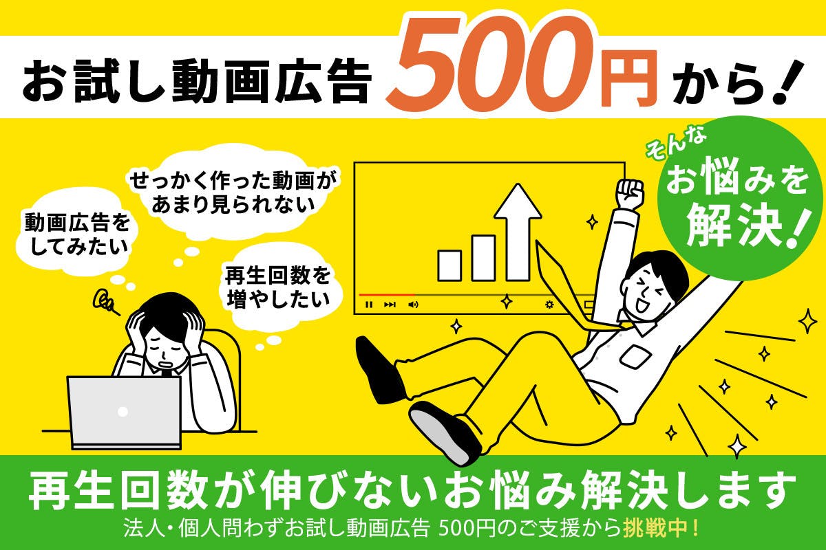 動画広告と聞くと「やっとことが無い」「高そう」「不安」といったご意見が多く、それならプロが提供する安価のお試しプランを作成し配信される喜びを味わって頂きたく破格の500円からのお試しプランを立ち上げてみました。