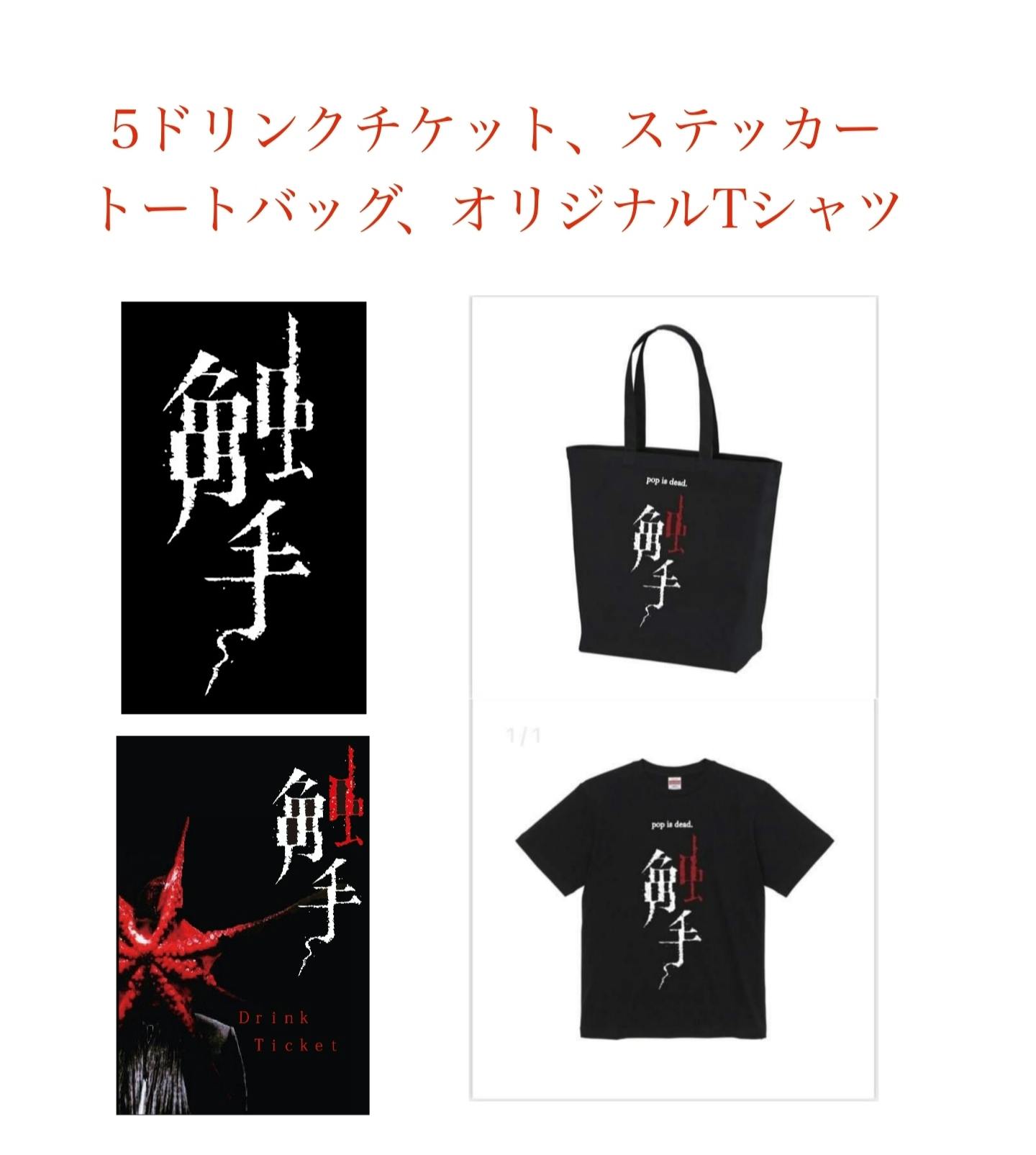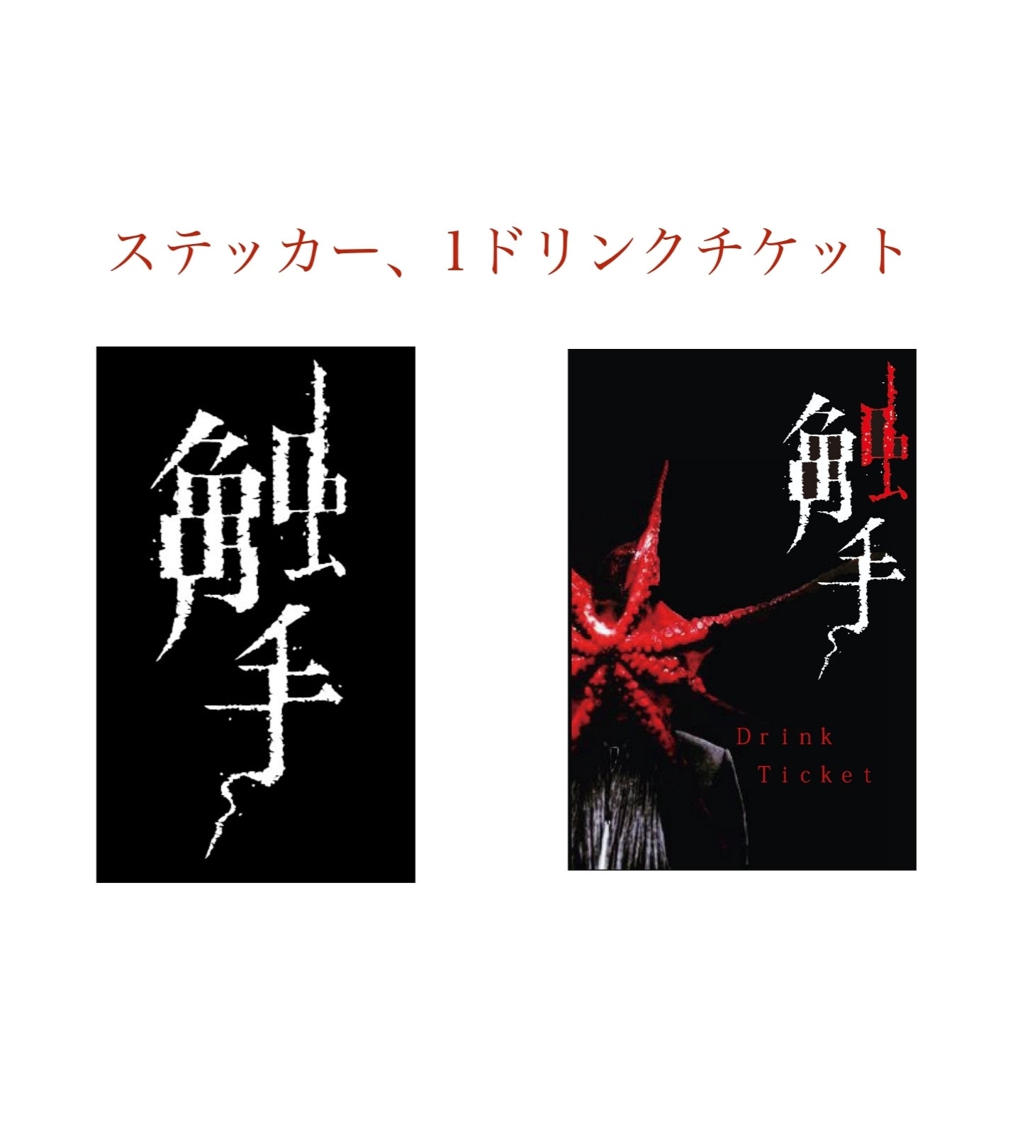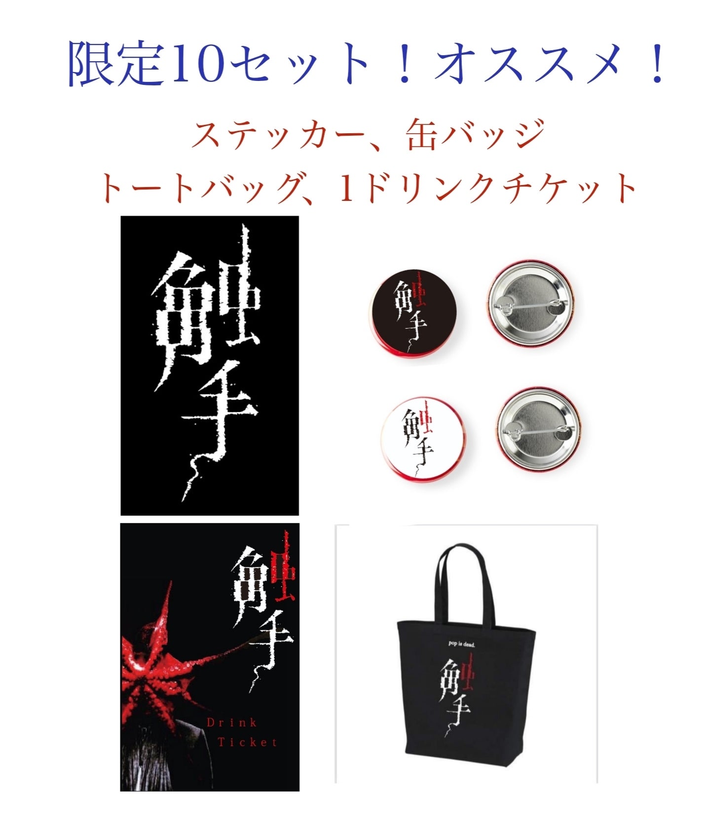 触手オリジナルステッカー(約5㎝×3㎝)、オリジナル缶バッジ(25ミリ白、黒各1個)