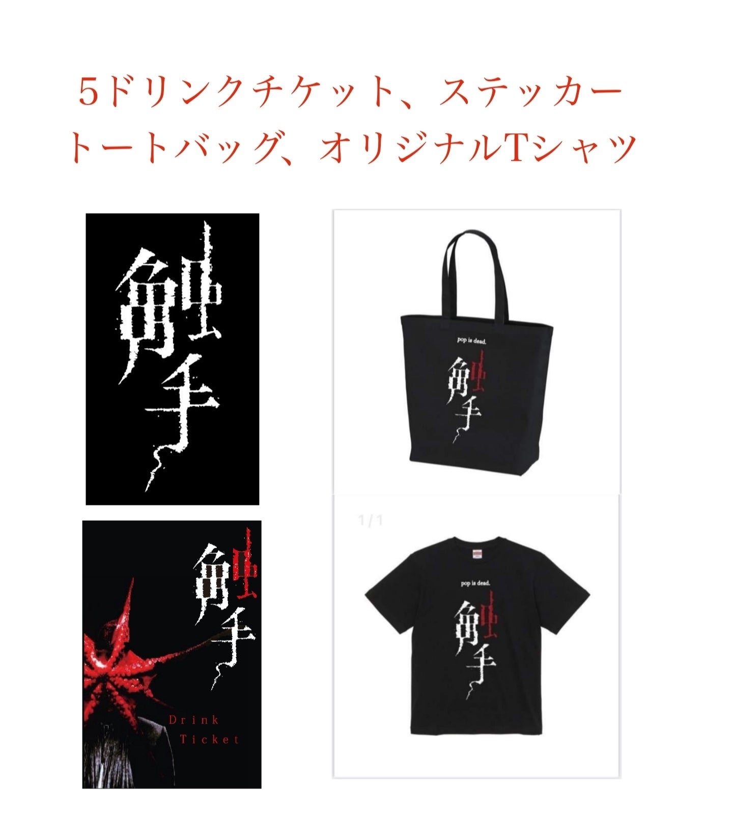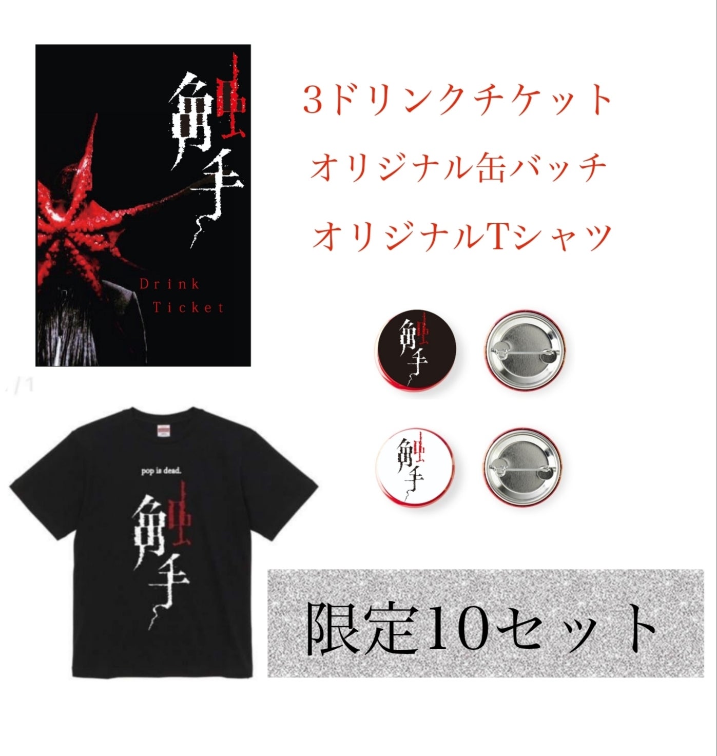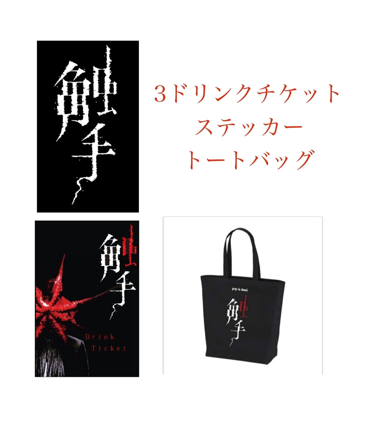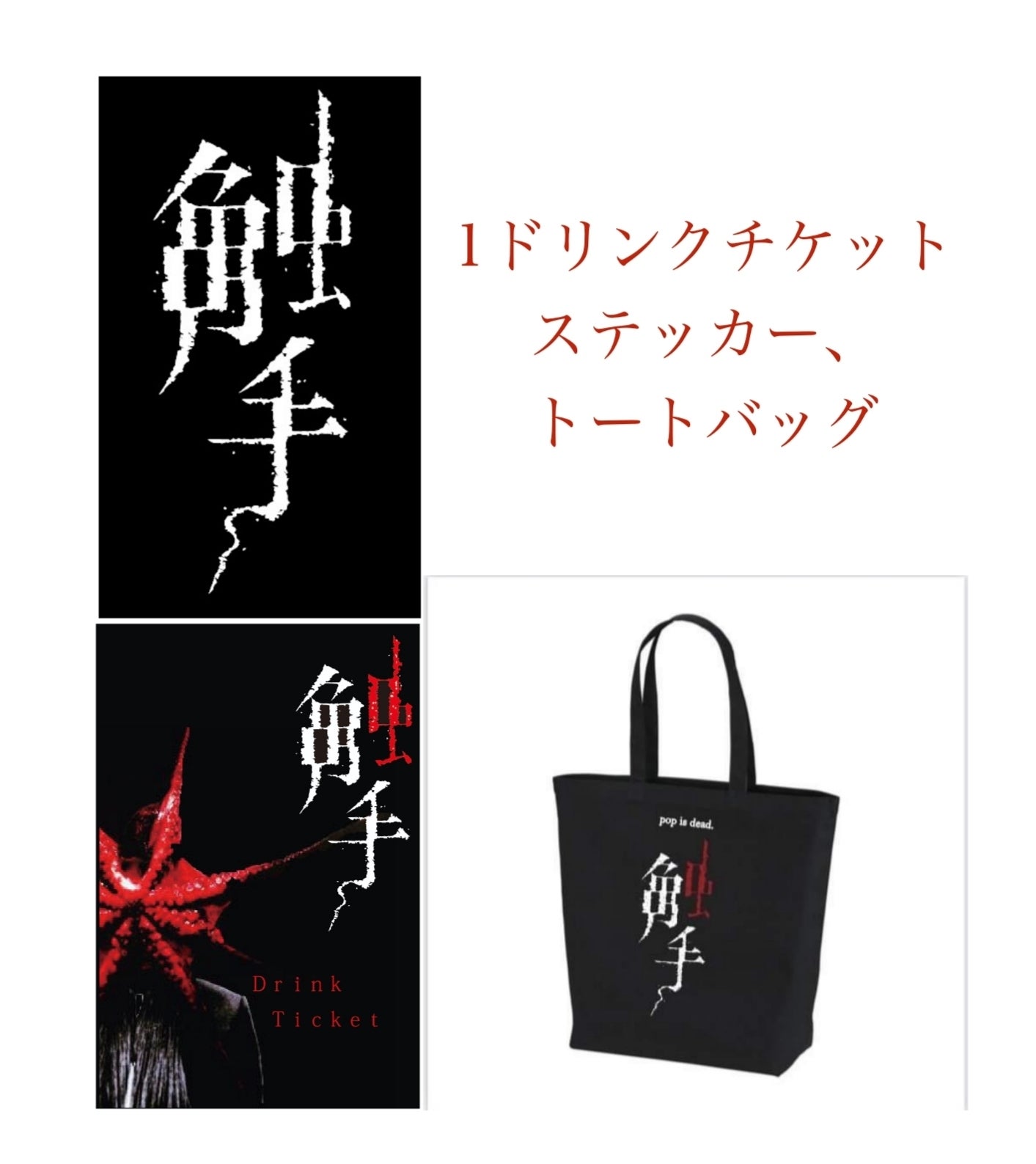 触手オリジナルステッカー(約5㎝×3㎝)、オリジナル缶バッジ(25ミリ白、黒各1個)
