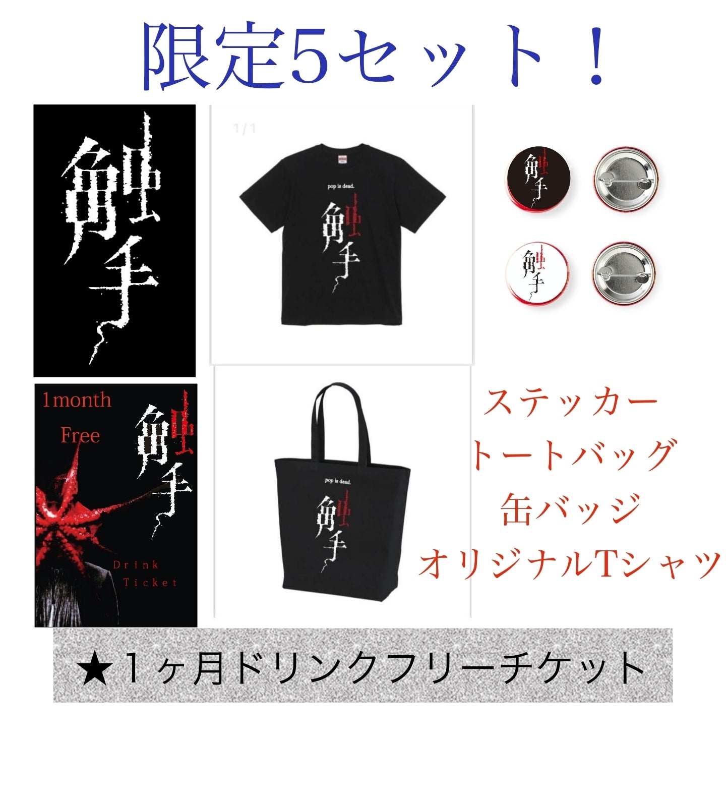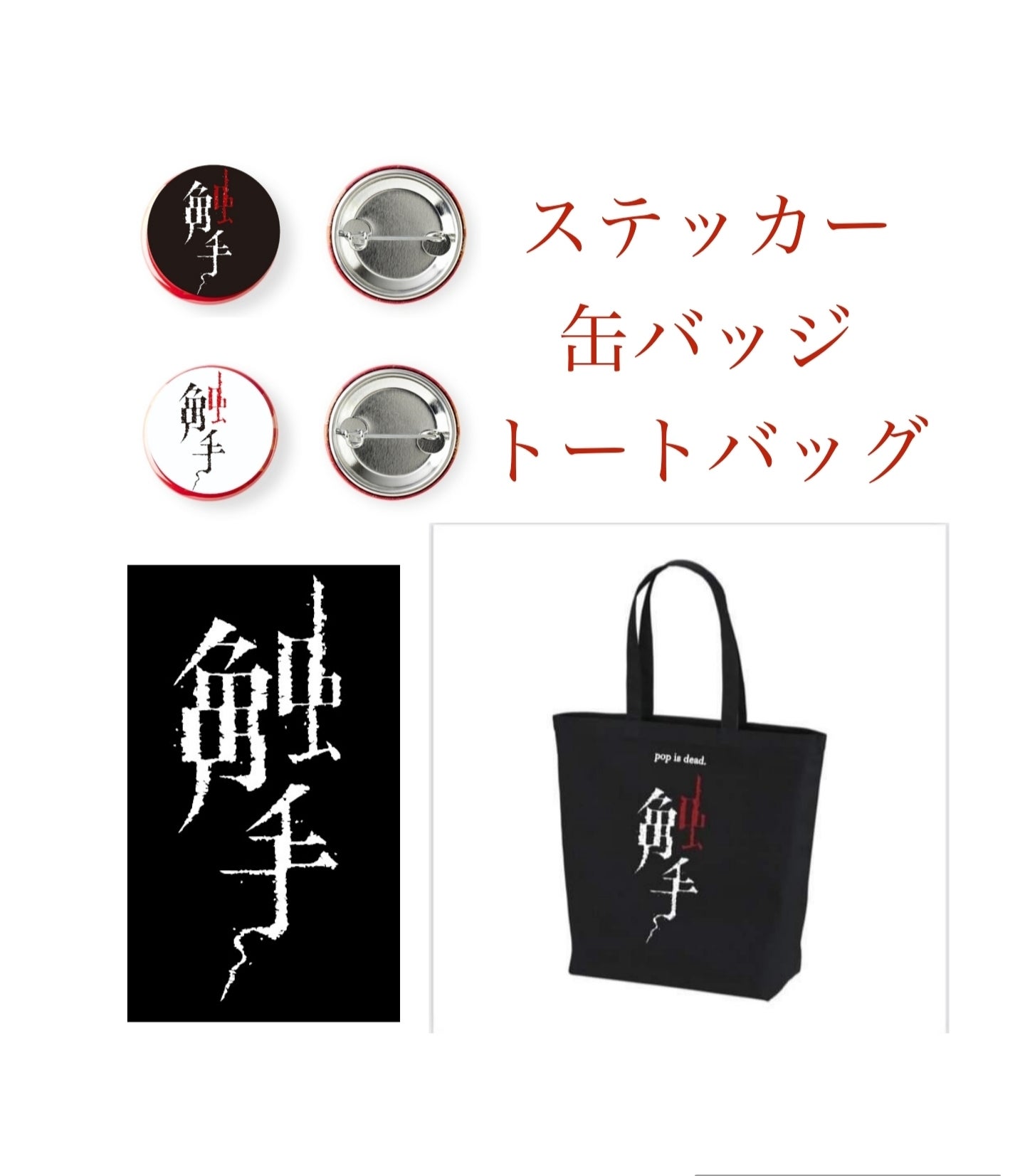 触手オリジナルステッカー(約5㎝×3㎝)、缶バッジ(25ミリ白、黒各1個)