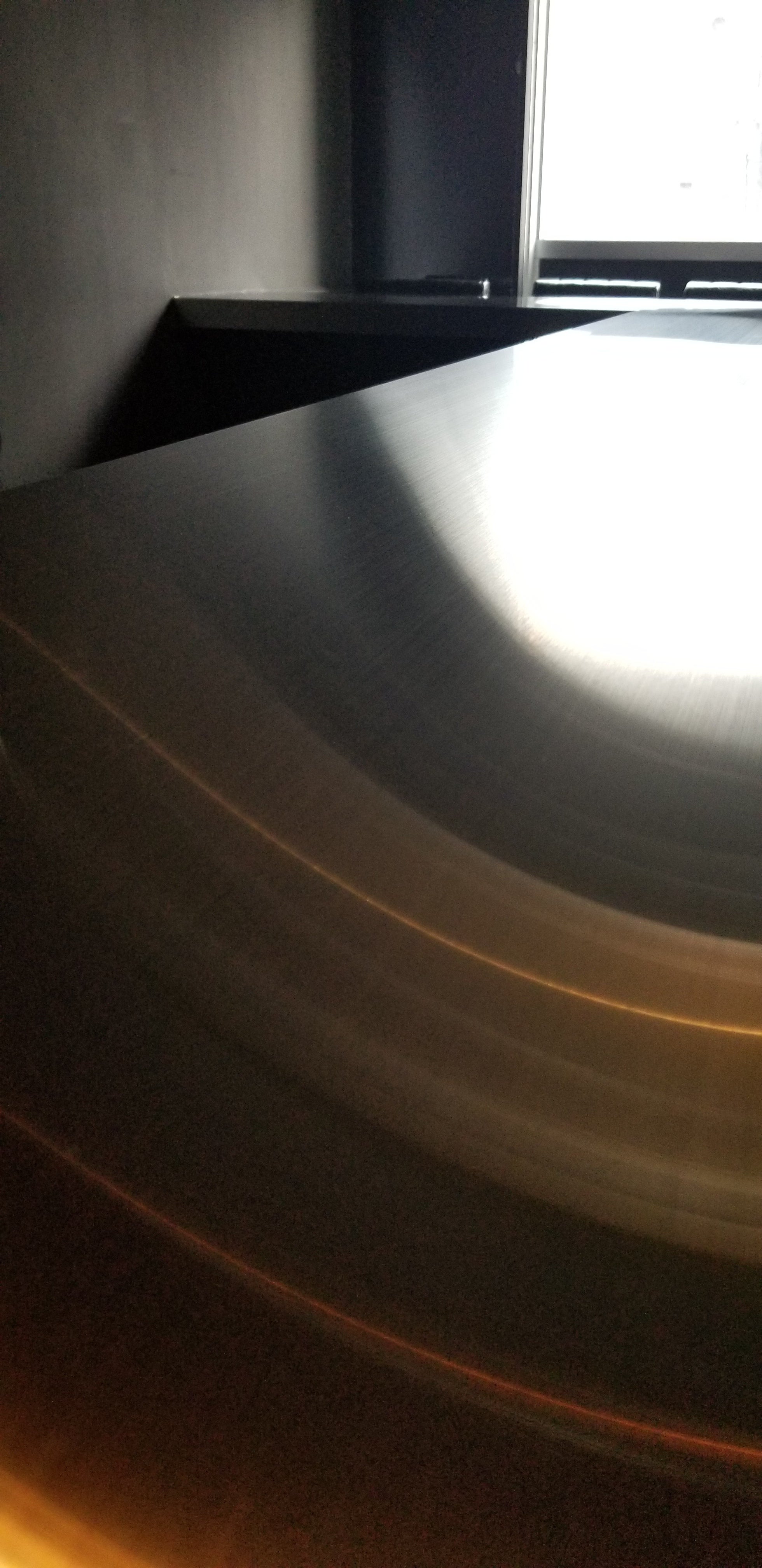 こだわったステンレス1枚の特注のカウンターテーブル。最初からこのテーブルだけは決めていました。店の変わりゆく様子がたまりません!