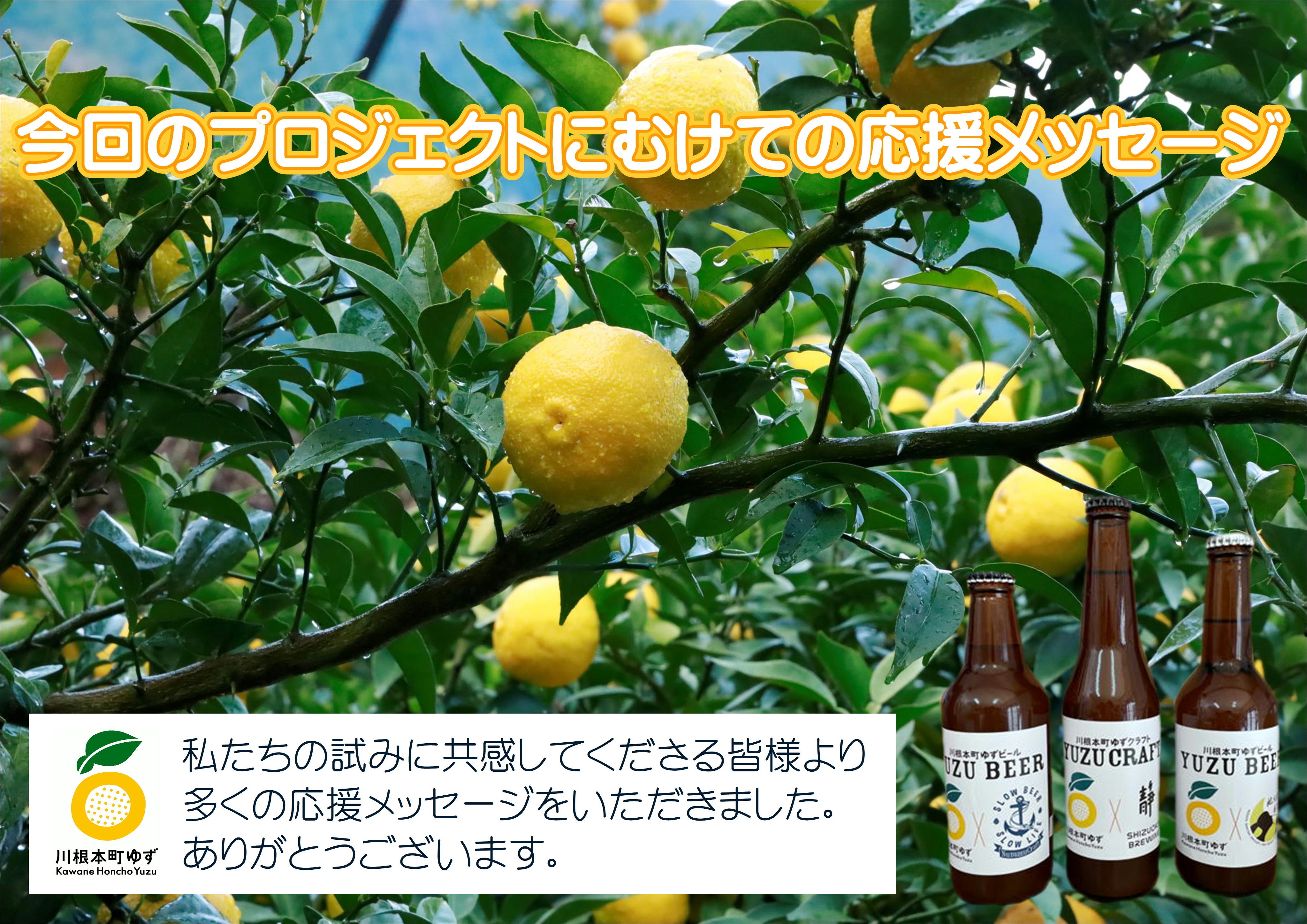 [川根本町 町長 薗田 靖邦さまより]「ゆずビール」の商品開発や販路拡大への取組が、ゆずの生産はもとより茶業や観光業を含めた地域産業への波及効果や、町の認知度向上、ひいては持続可能なまちづくりへとつながるものと考えており、当町も本プロジェクトを応援します。