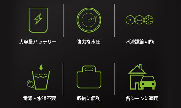 バッテリーを本体に取り付けて電源をオンにすると洗浄可能な簡単操作!コンセントへの接続は不要で、屋外の駐車場や公園、広場などのアウトドアシーンでも気軽に使用できます。
