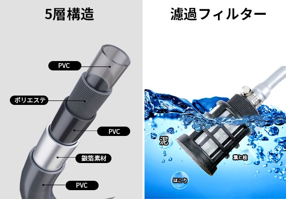 高品質の給水ホースは5層式構造で耐久性が向上!フィルターも搭載されて、お風呂の残り湯や雨水、川を再利用する際の細かなゴミなどの不純物を濾過できます。