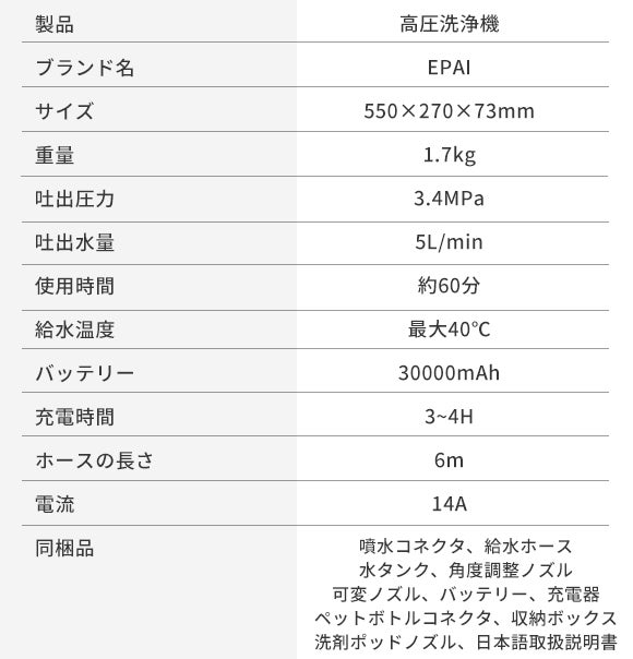 EPAIは大型モーターを採用しているので、圧倒的なパワーを発揮できます。3.4Mpaの強力な高水圧と300L/Hの大流量で水を噴射可能で、こびりついた頑固な汚れの洗浄にも期待できます。