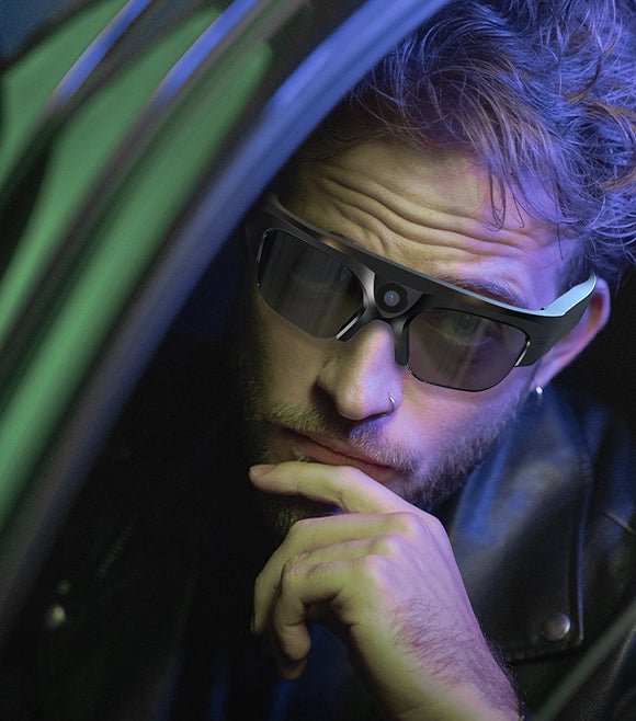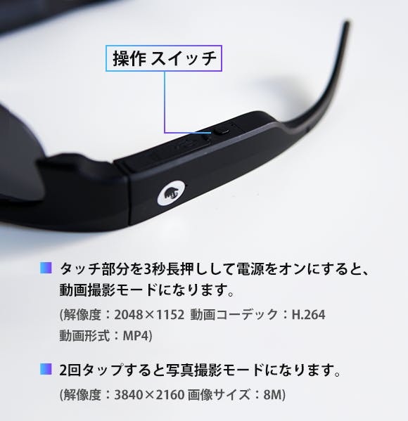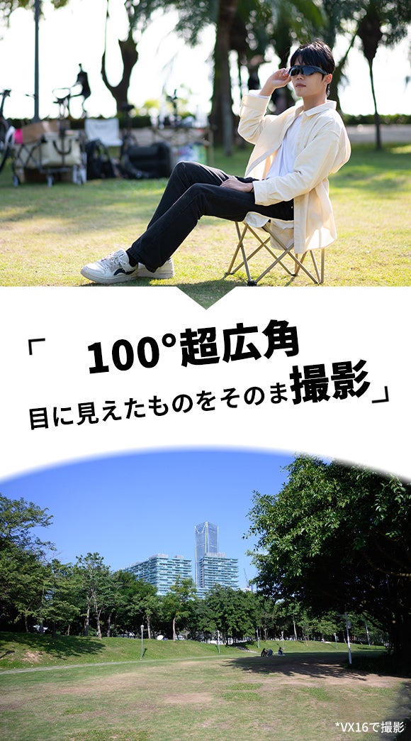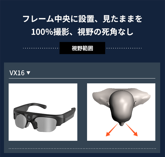 カメラがフレームの端に設置されているスマート眼鏡も多いですが、VX16はレンズをフレームの中央部分に設置しておりますので、視野とずれない見たままの光景を撮影可能です。