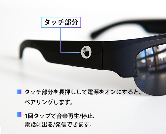 右側のフレームのタッチ部分を長押しすると、Bluetoothイヤホンが起動し、スマホとすばやくペアリングできます。