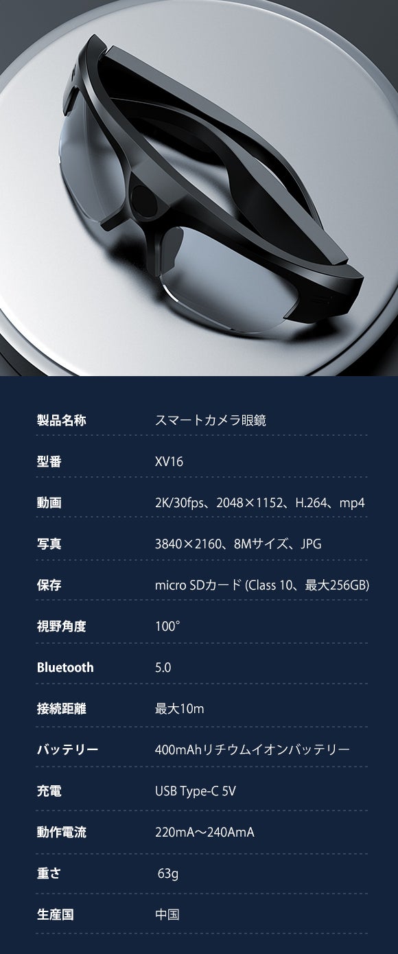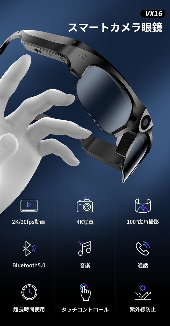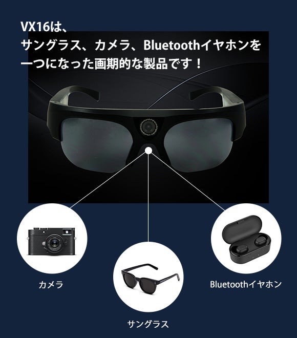 VX16はサングラス+高画質カメラ+Bluetoothイヤホンがひとつになった画期的な商品です。気に入った風景などをボタンひとつですぐに撮影して、目で見たままの写真や動画を記録できます。また、Bluetoothイヤホンとしても使え、ノイズリダクションマイクも内蔵。音楽鑑賞や通話なども可能な便利な1台です。