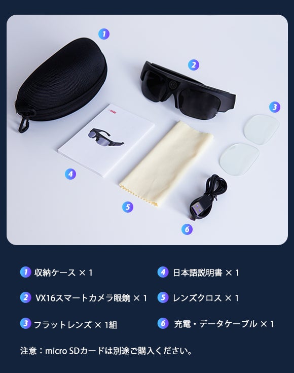 VX16はサングラス+高画質カメラ+Bluetoothイヤホンがひとつになった画期的な商品です。気に入った風景などをボタンひとつですぐに撮影して、目で見たままの写真や動画を記録できます。また、Bluetoothイヤホンとしても使え、ノイズリダクションマイクも内蔵。音楽鑑賞や通話なども可能な便利な1台です。