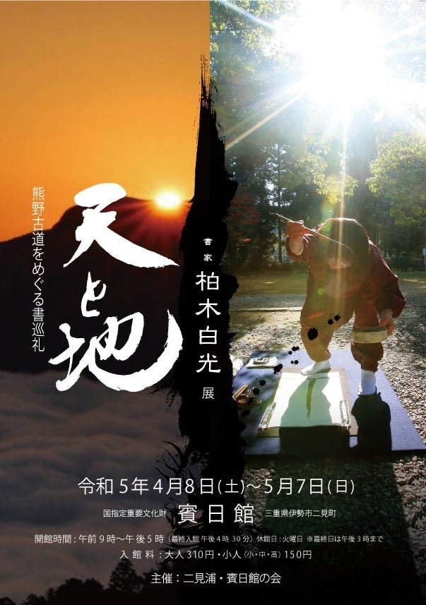 2023年4月8日〜5月7日に三重県伊勢市の「賓日館」での展覧会『天と地 熊野をめぐる書巡礼』の開催が決定。賓日館は明治20年に建立され、日本の伝統建築の極みを今に伝える国指定重要文化財です。本展覧会では、『天と地』となる主要な作品を展示するとともに、熊野古道にゆかりのある専門家による多彩なイベントが開催されます。