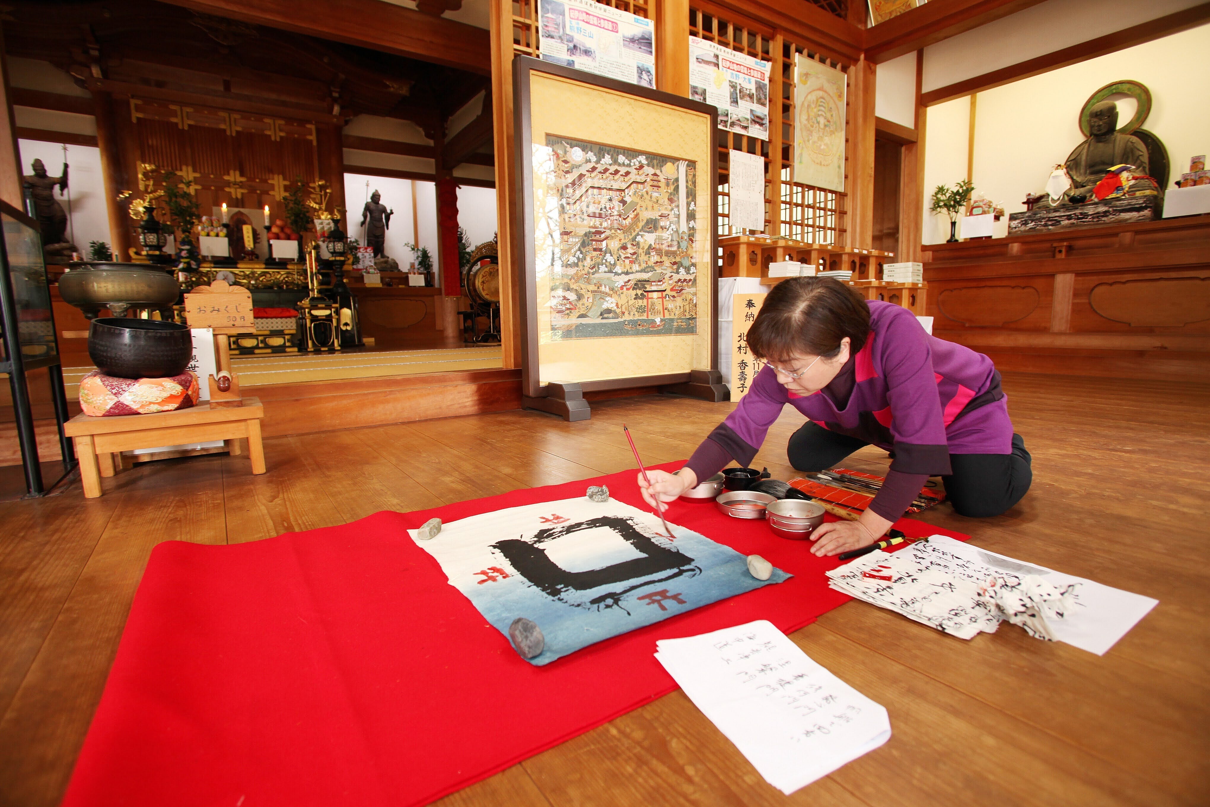 作品「恵比寿まわし歌」では、ネパールで梵字と仏画を学んだ柏木白光によって恵比寿様が描かれています。恵比寿様の周りに書かれているのは、「まずはめでたや、まずはめでたや」から始まる「恵比寿まわし歌」です。日本古来の福の神であり、漁業や商売の神として祀られてきた恵比寿様のとてもおめでたい作品です。