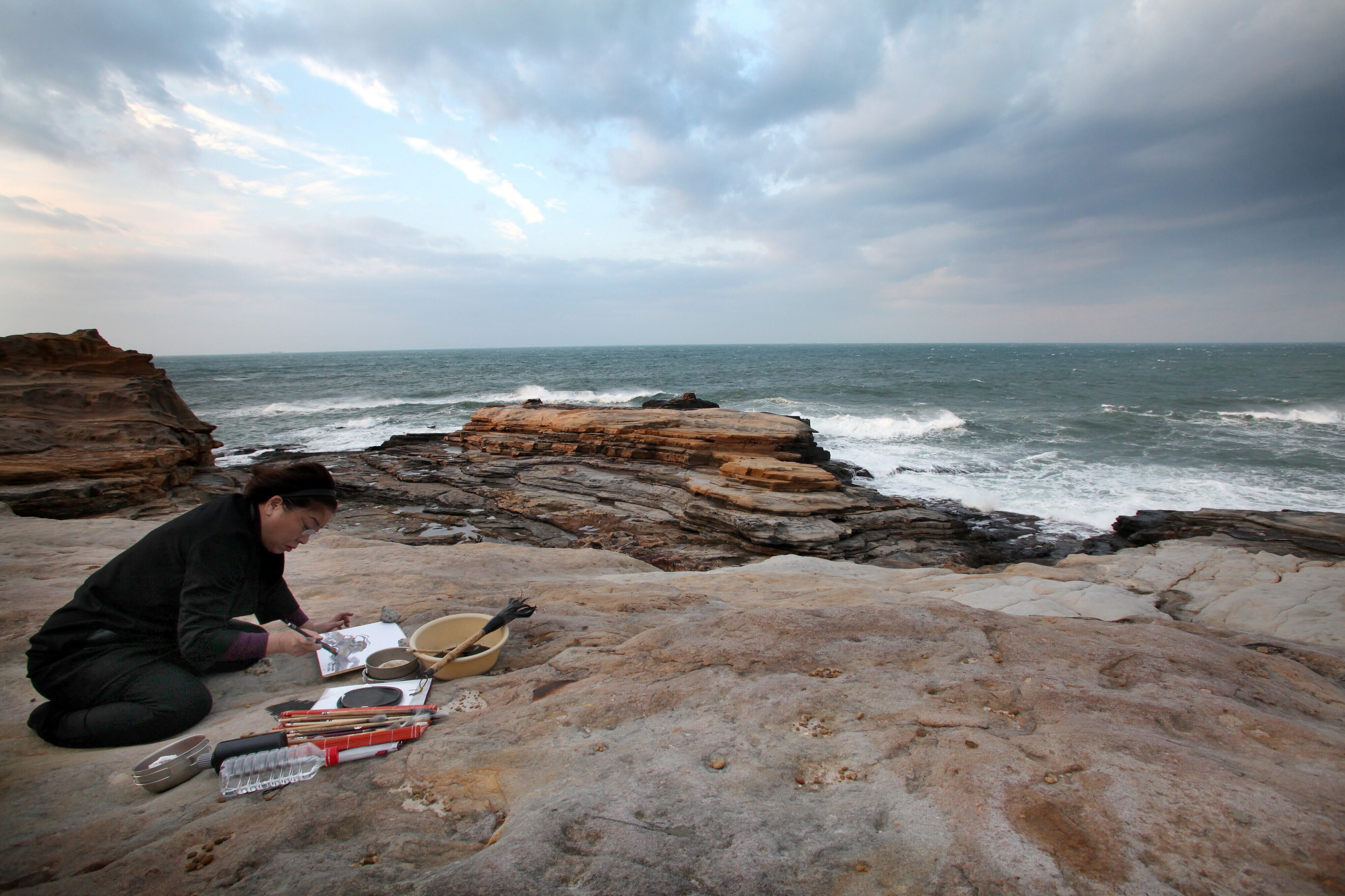 激しい波が太古の地球が育んだ地層を露わにする「千畳敷」。作品を制作した日は台風の直後。激しい波が岩に打ちつけ、水飛沫を上げる一方で、晴天に向かって雲が走り続けます。作品では、千畳敷は淡い墨で、激しい波は金で描かれ、繊細な文字で詩文「千畳敷の断崖に 波しぶきを上げる 魂に打つは 紺碧の海」が書かれています。