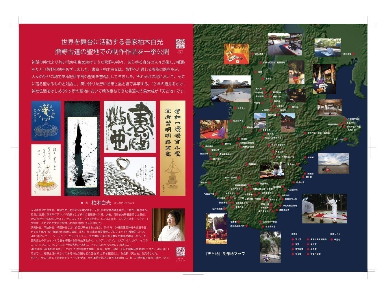 12 年の歳月をかけ、神社仏閣をはじめ 89ヶ所の聖地において積み重ねてきた書巡礼の集大成が「天と地」です。全作品を収録した作品集『天と地 熊野をめぐる書巡礼』を冨山房インターナショナルより出版します。更に、三重県伊勢市の国指定重要文化財「賓日館」にて、2023年4月8日から5月7日まで、展覧会『天と地 熊野をめぐる書巡礼』を開催いたします。