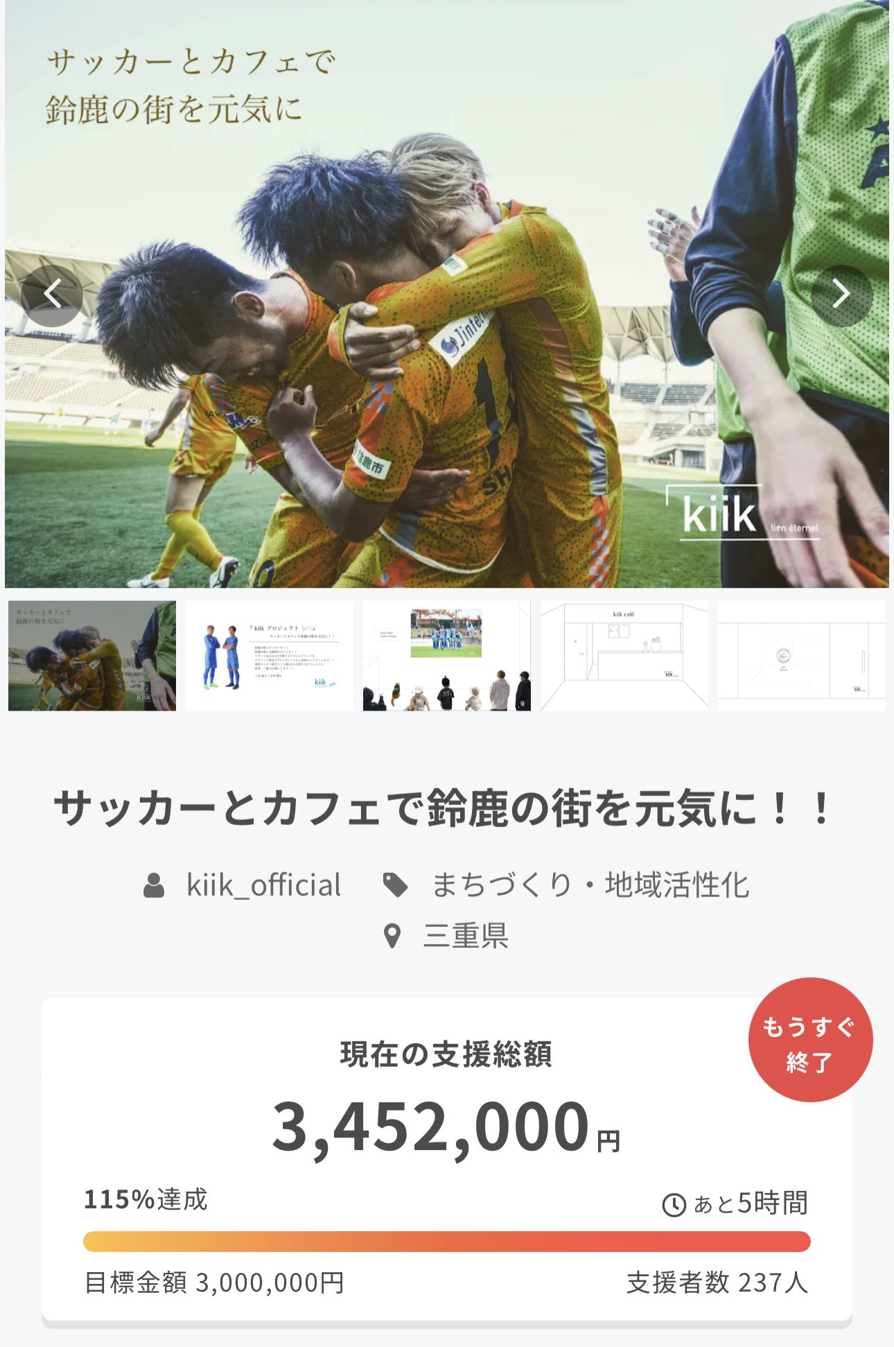 2023/05/31 18:09『 サッカーとカフェで街を元気に 』目標金額であった300万円皆様のご協力により達成することができました!!本当に本当にありがとうございました!!!ちなみに目標達成した昨日5月30日はとむの3歳の誕生日でした!!!とむお誕生日おめでとう!!!これからもよろしくねッ!!!第1弾、第2弾、第3弾想いを綴った文章皆様の声をもとに新たなリターン品の追加2ヶ月間に渡るSNSでの情報発信そして同時にリーグ戦に向けた日々の練習や試合『 BOASORTE 』脱毛スタッフとしての仕事さらには『 kiik 』の新作の製作本業は何ですか??そう聞かれても回答に困るこの2ヵ月間でした。。頭が痛くなるほど大変だったこの2ヵ月間は、凄い新鮮でとても充実した日々でしたクラウドファンディングが終わると皆んなの家に時間をかけて作ったリターン品が届いて、カフェができて皆んなが笑って、友達に「 このカフェ私も一緒に創ったんだよー!」って自慢なんかしたりして、週末には待ちに待ったパブリックビューイングができて…一方で、カフェのオーナーとしてやらなければいけない事は山ほどあって、楽なことばかりじゃなく現実を冷静に客観視し、物事を判断しなければならない状況も出てくると思いますカフェを経営していくうえで不安なことは沢山あるし、まだまだ未熟で全てを完璧にすることはできないけど、今回この『 kiik プロジェクト 』で一緒にカフェを創ってくれた皆んなと協力して、これから先も工夫して色んな壁を乗り越えていけたらいいなって思います『 関わる全てのヒトを幸せに 』追記クラウドファンディングを始めるにあたって、大抵の人はクラウドファンディングのサイトにいって色んな人のプロジェクトを見て、それを真似て制作すると思います自分の場合は他人のプロジェクトを見ると、似たようなプロジェクトになると思い下調べなしでプロジェクトを制作しましたクラウドファンディングはプロジェクトを公開するにあたって、『 公開申請 』というそのプロジェクトを公開するための審査が担当の人によって行われますもちろん自分の場合は、始める前に他のクラウドファンディングの先輩方のプロジェクトを見てないので『 申請棄却 』となり、編集のやり直しが何度もありました2ヵ月間のプロジェクトが終了した今となっては、担当して頂いた方には本当に申し訳なかったなと思う反面、今回の『 kiik プロジェクト 』は自分にしか作れないプロジェクトだと自信を持って言えることができたことに心から感謝したいと思いますこれからクラウドファンディングを始めようと考えている方に向けて何かアドバイスをするとしたら、それはオリジナリティーのあるプロジェクトを創ることを強くお勧めします他のプロジェクトにない自分だけが持っている想いを真っ直ぐBOASORTE .『 kiik - lien éternel 』 三宅 海斗 | 中村 健人_____________________三宅 海斗 【 みやけ かいと 】岡山県倉敷市出身1997年8月27日 生まれ ( 25 )小学2年生から兄の影響でサッカーを始める小学校3年生からは高校生の練習にも参加倉敷トレセン、岡山県トレセン、ナショナルトレセン U-12 に選ばれるその後、倉敷北中学校、東福岡高校と進学し高校3年間で全国優勝を計3度経験したその後は鹿屋体育大学に進学するも1年時の終わりに海外へのチャレンジを決心するドイツ フォルトゥナ・デュッセルドルフ に加入し理想のサッカーを追求し、Jリーグに帰国健人とどうしてもサッカーがしたくて代理人にお願いして鹿児島ユナイテッドに加入そして昨シーズンハッピーセットで鈴鹿ポイントゲッターズに揃って加入今年からは健人を支える副キャプテンとして平均年齢【 24.2歳 】の若いチームで奮闘中中村 健人 【 なかむら けんと 】大分県佐伯市出身1997年9月1日 生まれ ( 25 )6歳から兄の影響でサッカーを始める大分県選抜U-12に選ばれるその後JFAアカデミー熊本宇城へ入校ナショナルトレセンU-15に選ばれるその後東福岡高校に入学し練習初日からトップチームに呼ばれる東福岡高校、明治大学と進学し高校と大学時代に合わせて計7回の全国優勝を経験鹿児島ユナイテッドFC、鈴鹿ポイントゲッターズと移籍をして現在はチームの絶対的な司令塔としてチームを率いる10番キャプテン_____________________協賛美容室『 Leap hair 』脱毛サロン『 BOASORTE 』鈴鹿店アパレルブランド『 kiik - lien éternel 』写真提供©SUZUKA PG もっと見る