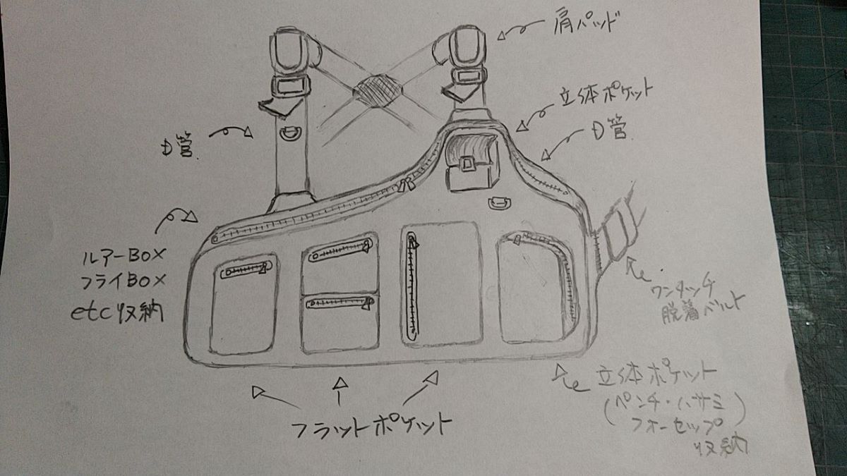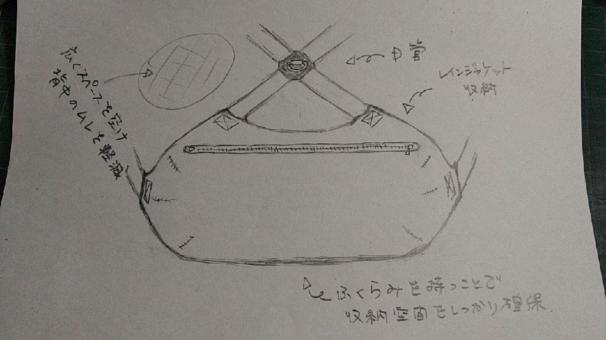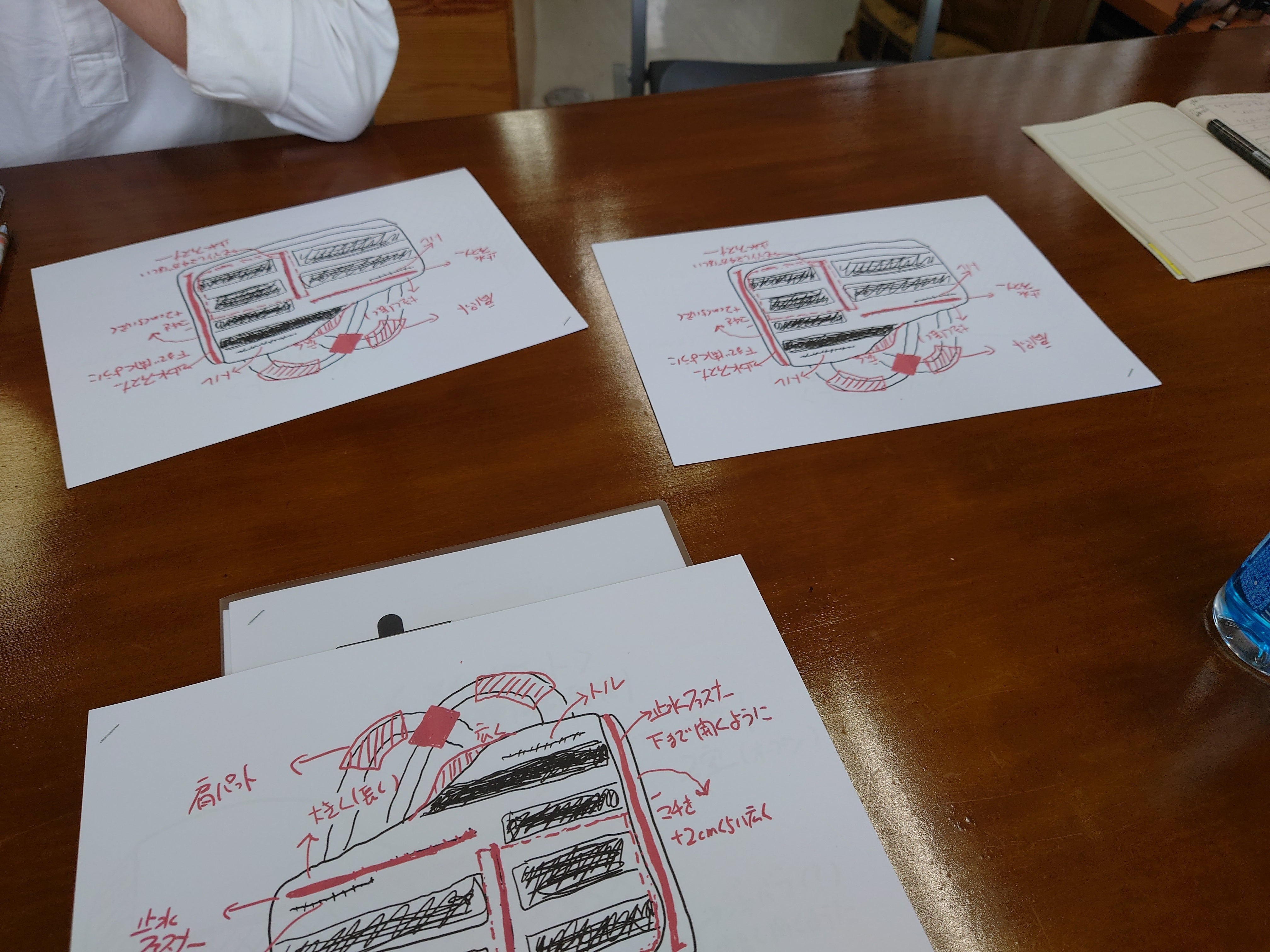 チェストバッグとバックパックを一体化するアイデアが生まれて、基となった手書きのデザイン画。