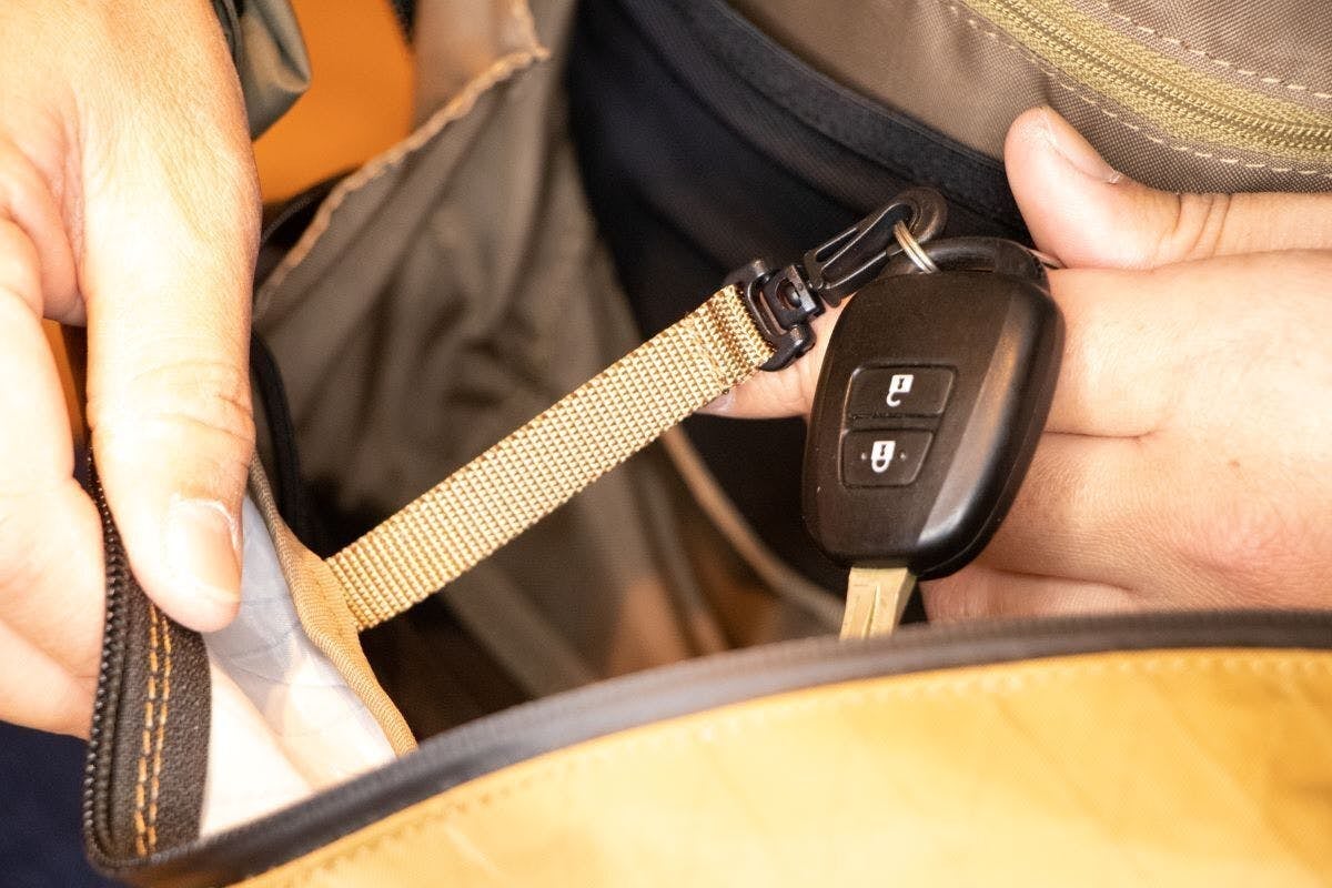 ⾞や家のカギなどの紛失を防ぐキーホルダー付き。
