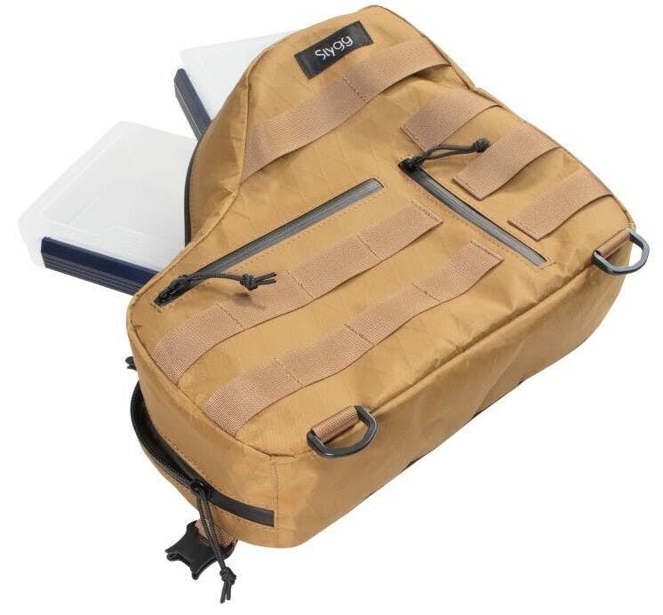 使用頻度の高いルアー&フライのBOXや、⼩物類もしっかり収まる収納⼒を備えつつ、見た目が印象的でファッショナブルなアシンメトリーなデザイン。メインポケットは開口部が大きく開き、仕切りの無いシンプルなオープンスペースで荷物の取り出しが容易です。