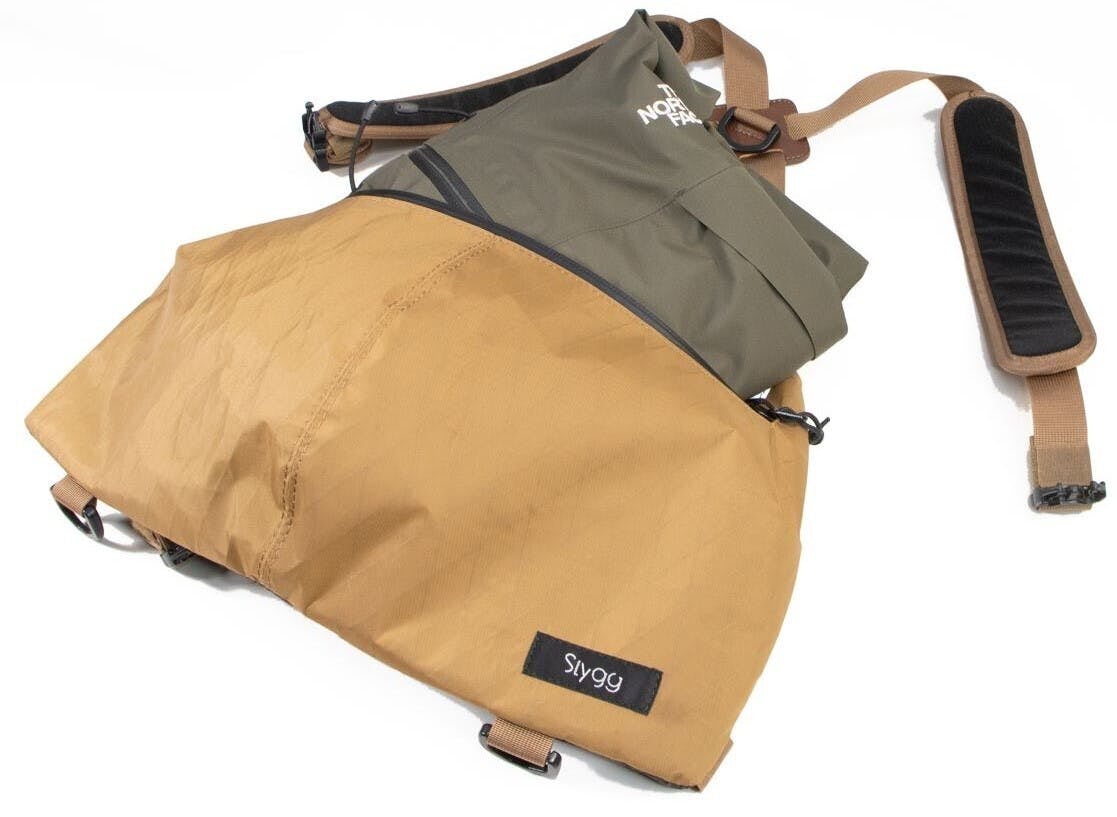 サンプル製作が始まった当初、チェストバッグはどうしてもサイズ的な制限がある為に、釣りやアウトドア等で使用する小物類だけならば収納は出来るのですが、それだけでいっぱいになってしまって、レインウェアや飲み物(ペットボトル)等を収納するスペースを確保することが出来ませんでした。フィールドテストをしていた北海道の山奥の河川や湖では、突然の雨や気温の低下でレインウェアや飲み物、さらにちょっとした食料が無ければ命にかかわることも考えられます。