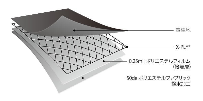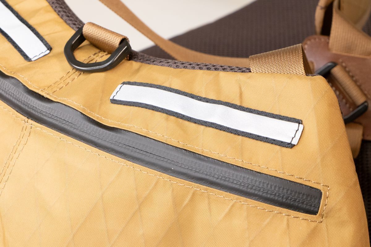 物を⼊れるためのバッグなので、強度はもちろんですがバッグ⾃体を軽量化しなければ⾝体への負担は軽減されません。様々な素材を検討し防⽔性・⽣地の強度、さらに軽さを求めた結果、ヨットの帆に使われている話題の新素材「X-PAC Ⓡ」を採⽤。