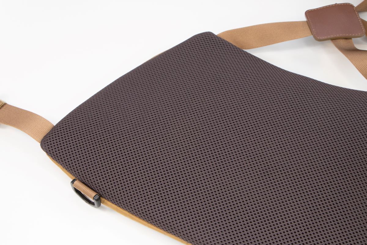 前後各バッグの裏⾯はパット⼊りの⽴体メッシュを採⽤し、蒸れを防ぎ身体へのフィット感にもこだわりました。