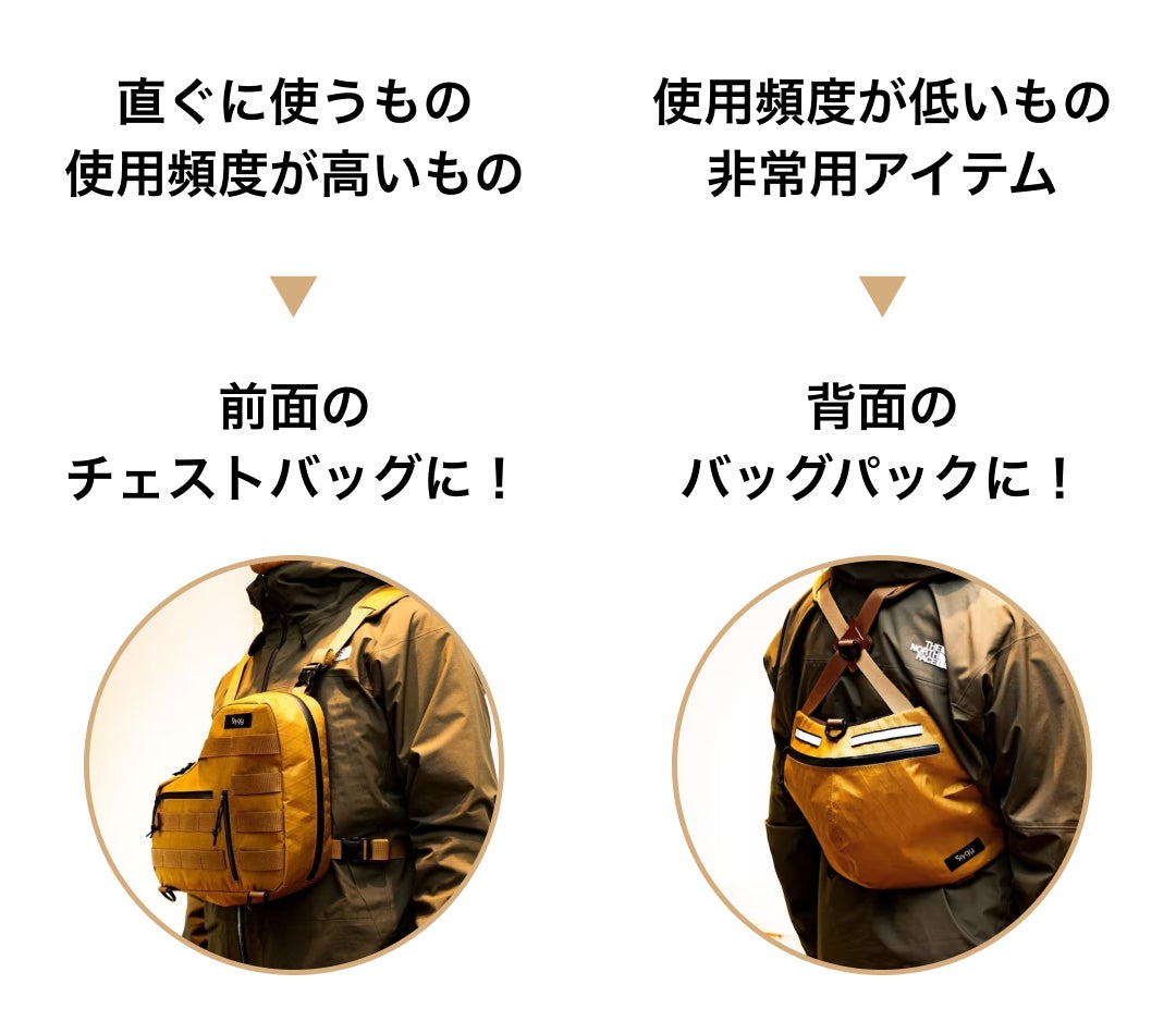そして生まれたアイデアが、チェストバッグとバックパックを一体化することで収納力をアップさせる!
