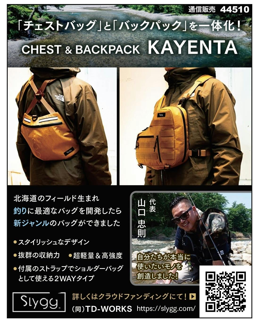 そんな様々なストレスを解決して「もっと釣りをスマートで快適にできるバッグ」を⽬指した結果、このユニークな形の「CHEST & BACKPACK "KAYENTA"(カエンタ)」が⽣まれました。