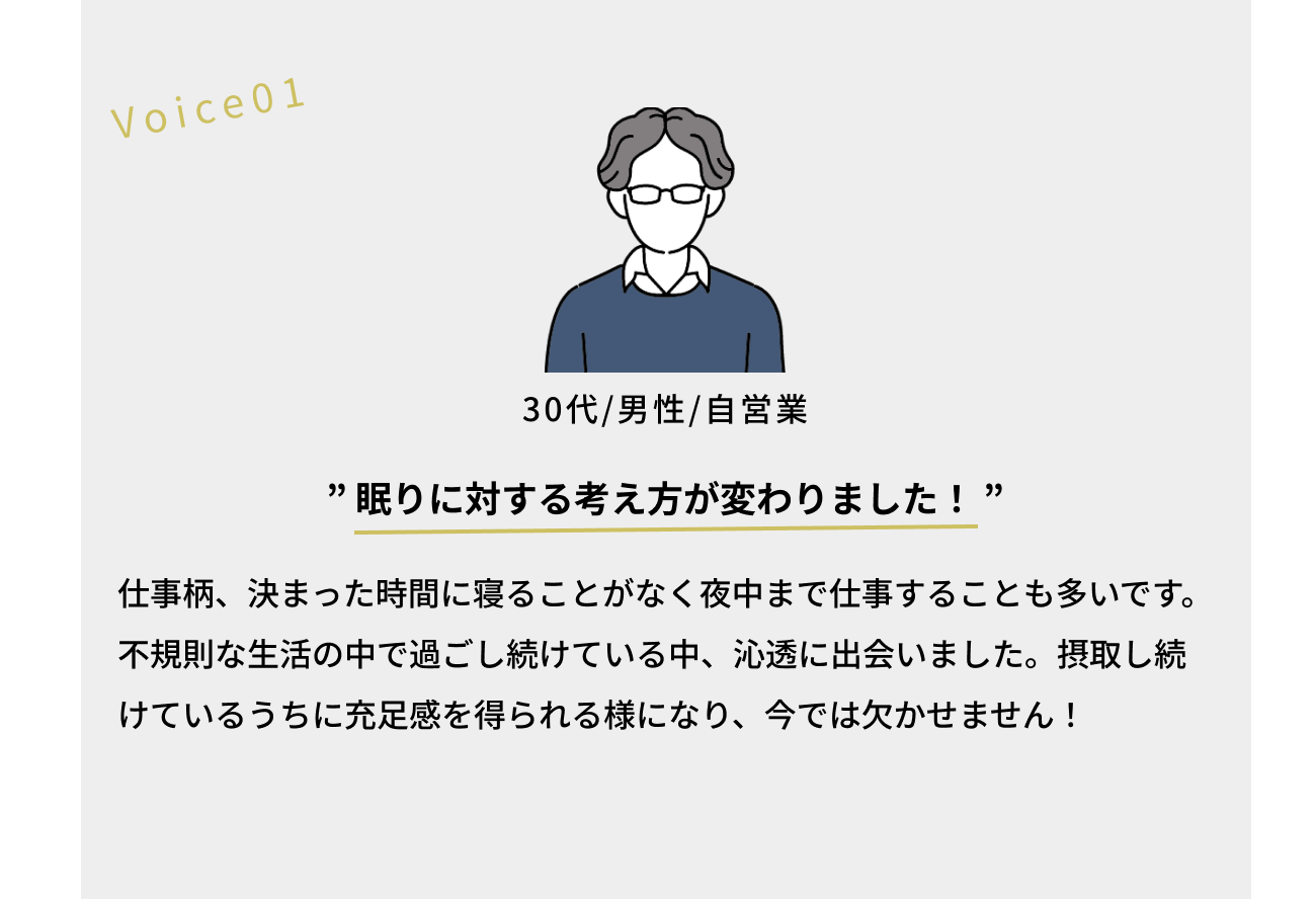 睡眠の質が良くなることで、身体のだるさもなくなり、活力がわき、仕事が捗るようになりました。